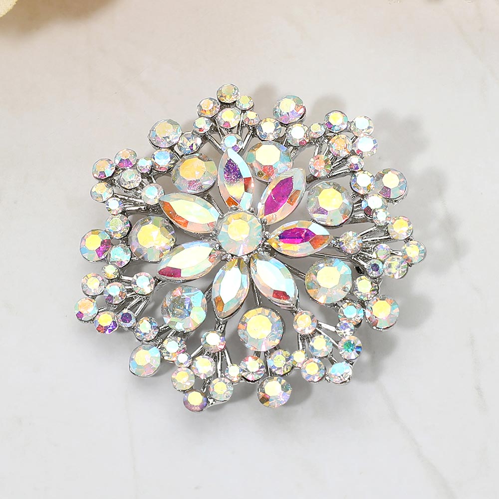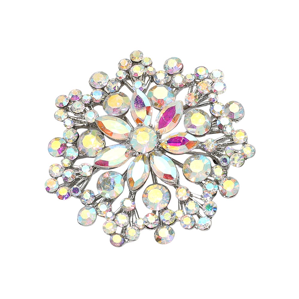 Details • Size : 2" X 2" • Pin Brooch • Eye-catching floral statement brooch designed with layered crystal accents arranged in a radiant cluster silhouette. This decorative pin adds elegant sparkle and dimension to jackets, scarves, dresses, and accessories, making it ideal for formal styling, seasonal collections, and fashion-forward displays. • Lead and Nickel Compliant
