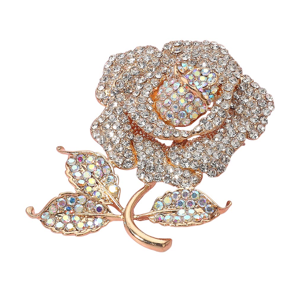 Details • Size : 2.25" X 3" • Pin Brooch • Add a touch of romance and sparkle with this crystal rose brooch, beautifully designed with shimmering stones for a radiant look. Perfect as a statement accessory on jackets, dresses, scarves, or handbags, this floral pin is ideal for weddings, special occasions, or as a thoughtful gift for someone special. • Lead and Nickel Compliant