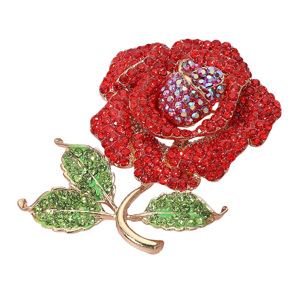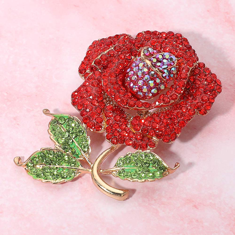Details • Size : 2.25" X 3" • Pin Brooch • Add a touch of romance and sparkle with this crystal rose brooch, beautifully designed with shimmering stones for a radiant look. Perfect as a statement accessory on jackets, dresses, scarves, or handbags, this floral pin is ideal for weddings, special occasions, or as a thoughtful gift for someone special. • Lead and Nickel Compliant