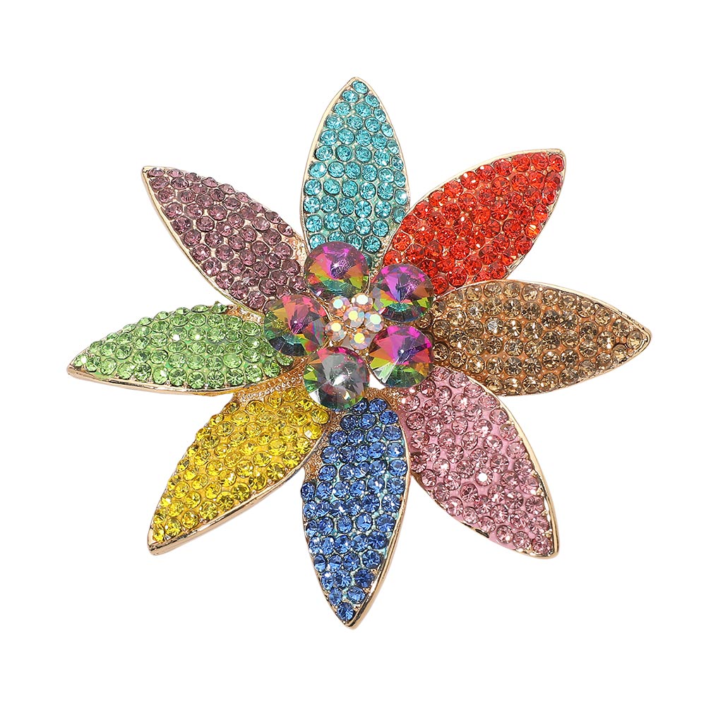 • Elegant floral brooch adorned with shimmering crystals arranged in a petal design. Perfect for adding a luxurious touch to coats, dresses, or scarves, this eye-catching accessory brings timeless glamour to any outfit.