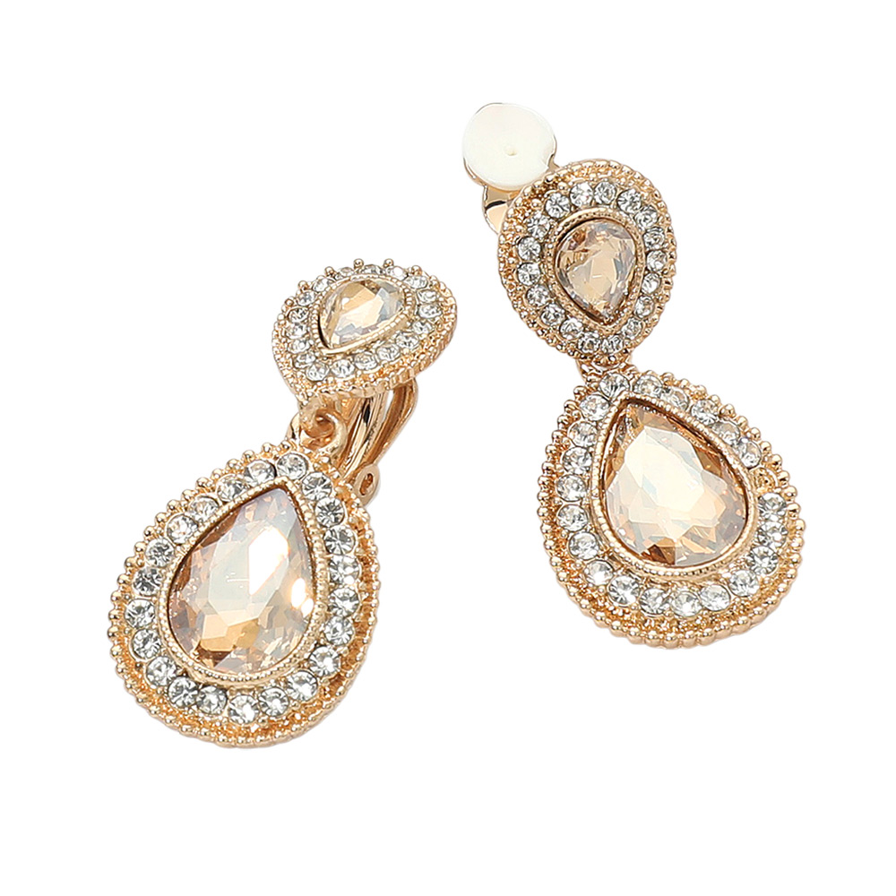 • These Teardrop Crystal Clip Earrings feature dazzling faceted stones framed by a halo of shimmering accents for an elegant and timeless look. Designed for comfort and sophistication, they add a touch of sparkle to any outfit, perfect for formal occasions or evening wear.