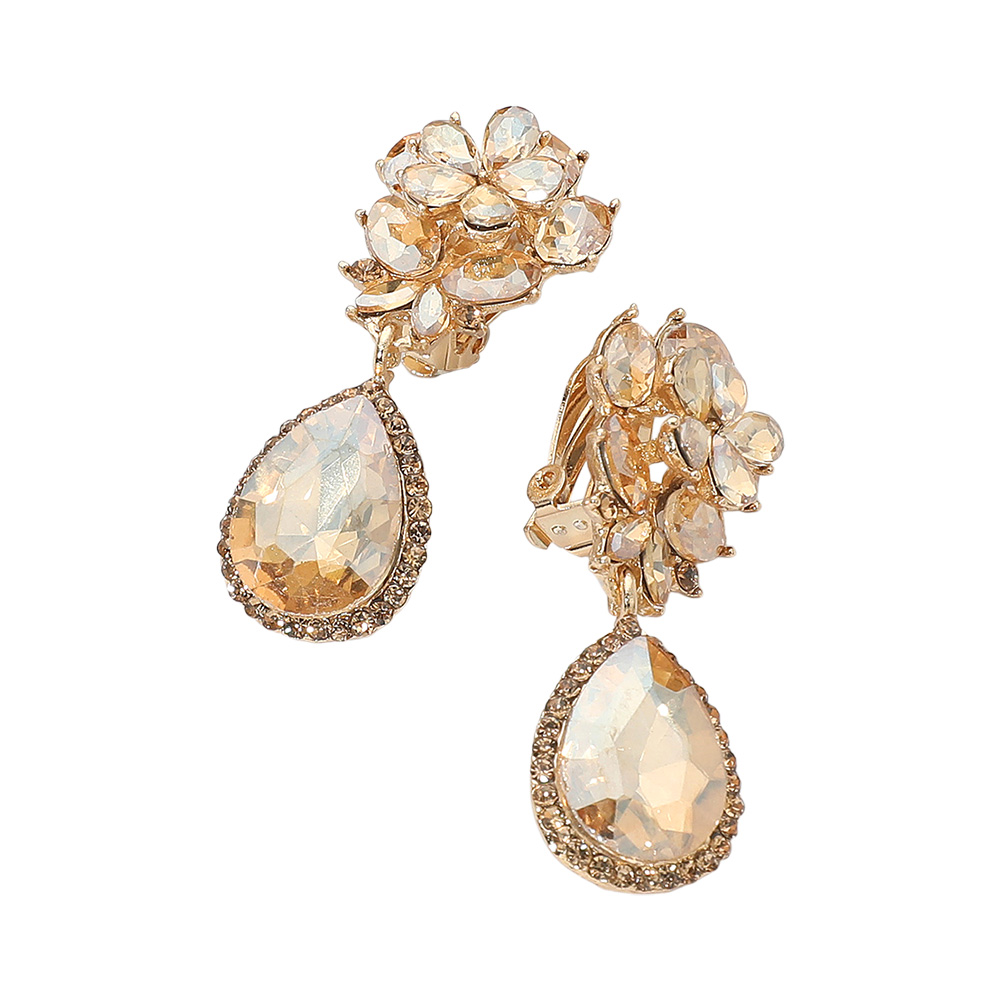 Flower Glass Crystal Teardrop Dangle Clip On Earrings