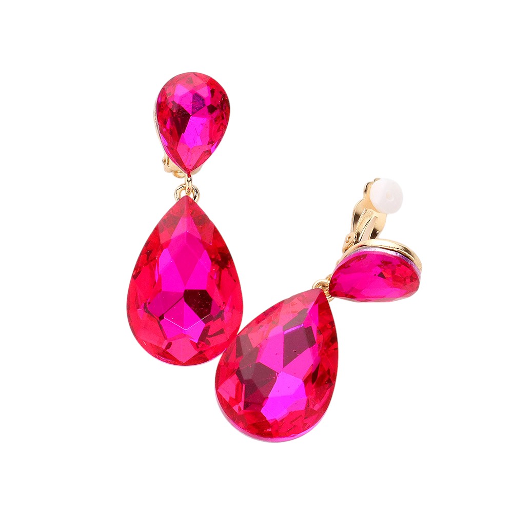 Glass Crystal Double Teardrop Clip on Evening Earrings