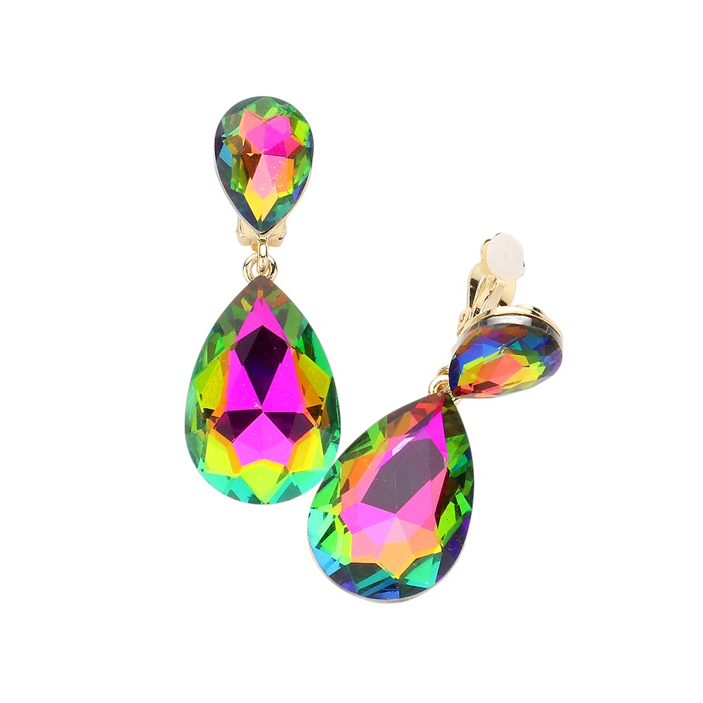 Glass Crystal Double Teardrop Clip on Evening Earrings