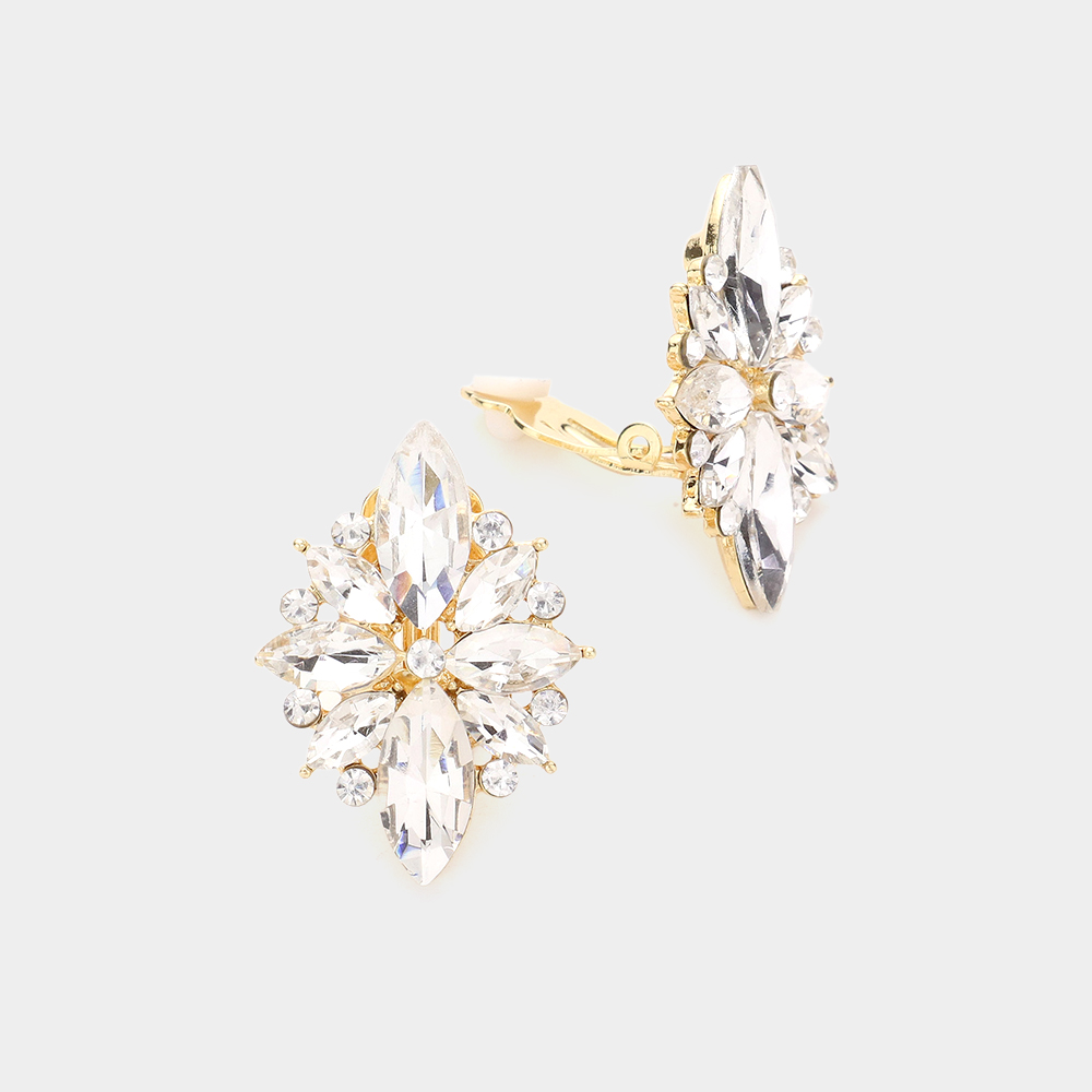 Marquise Round Stone Cluster Clip on Evening Earrings Marquise Round Stone Cluster Clip on Evening Earrings