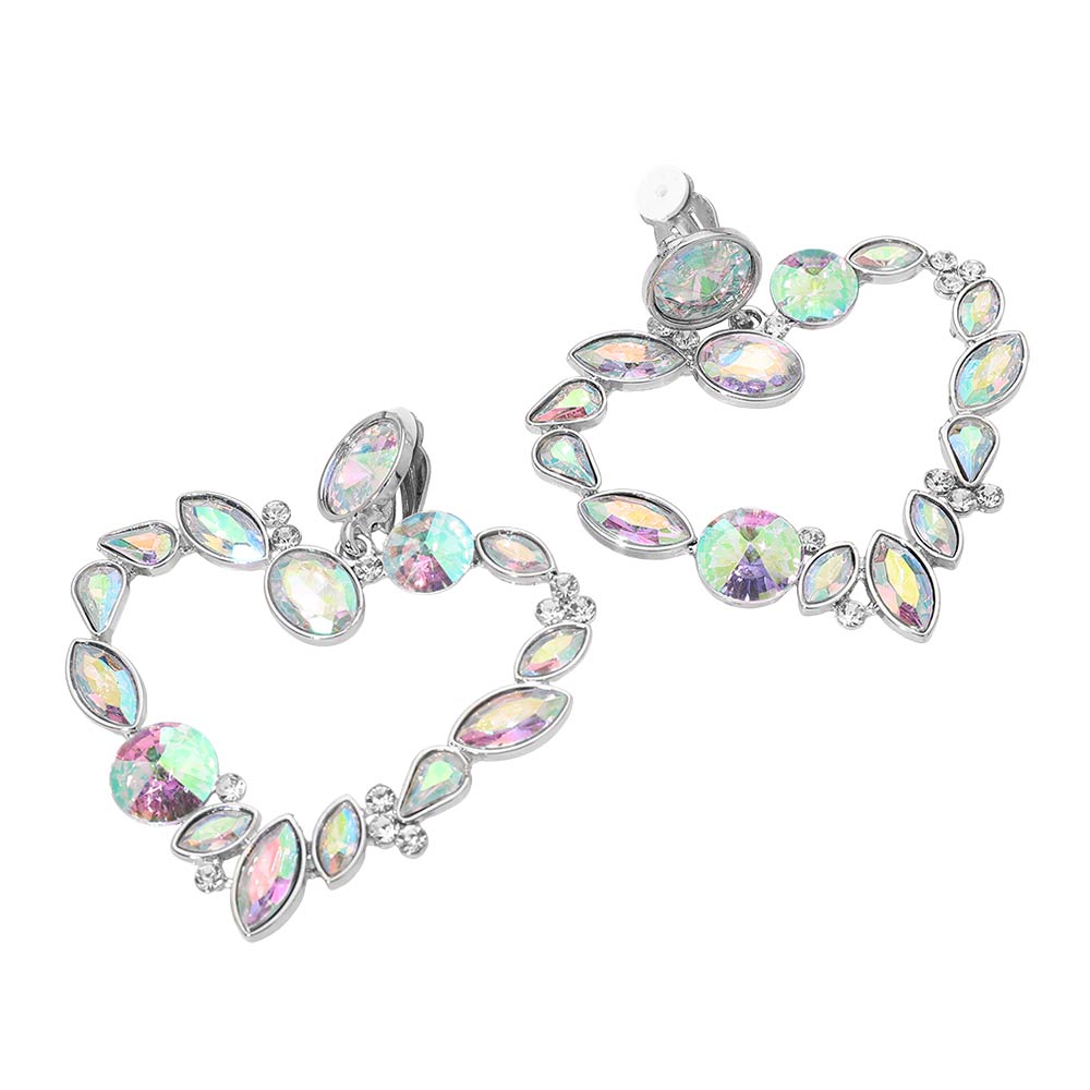 • These statement clip earrings feature a bold open-heart design accented with faceted crystals for eye-catching shine. Crafted to deliver dramatic impact without pierced ears, they offer secure clip-on comfort and elevated style. Ideal for special events, parties, or glam styling, these hoops bring instant polish and standout appeal to any jewelry collection while remaining lightweight and easy to wear.