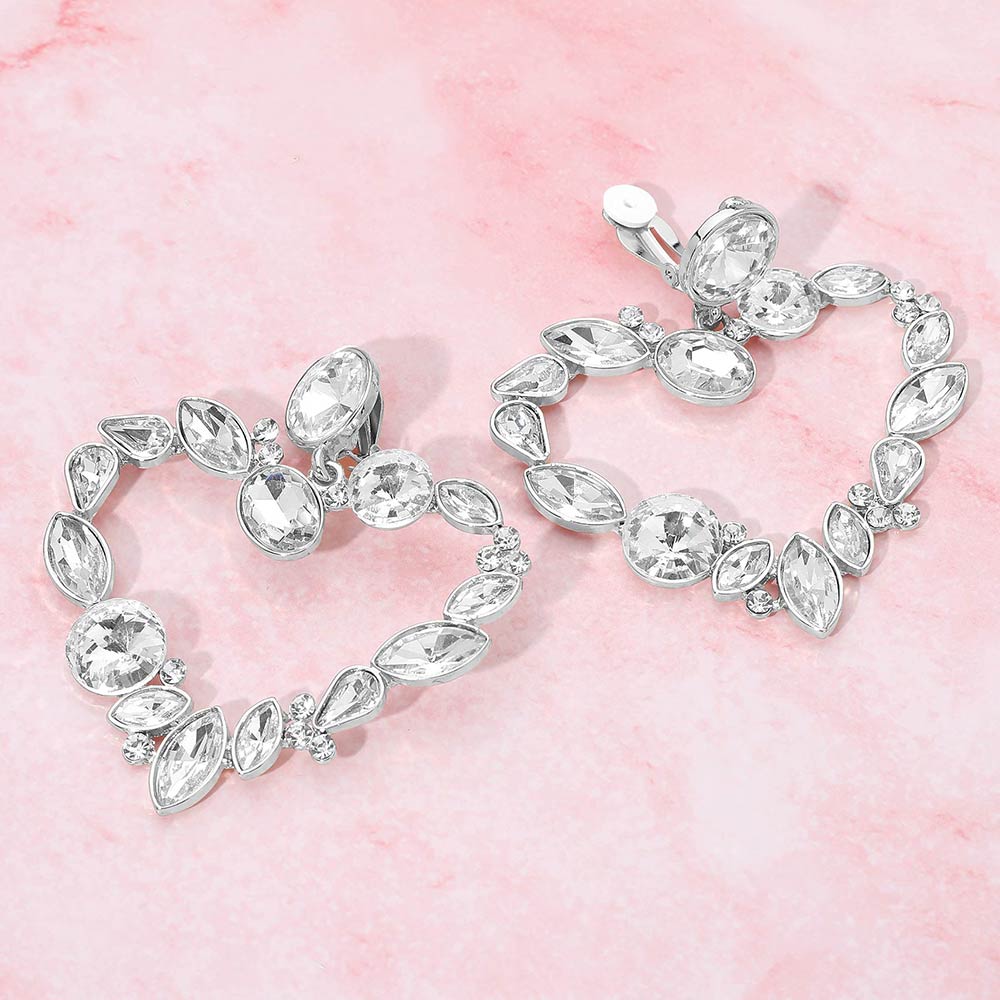 • These statement clip earrings feature a bold open-heart design accented with faceted crystals for eye-catching shine. Crafted to deliver dramatic impact without pierced ears, they offer secure clip-on comfort and elevated style. Ideal for special events, parties, or glam styling, these hoops bring instant polish and standout appeal to any jewelry collection while remaining lightweight and easy to wear.