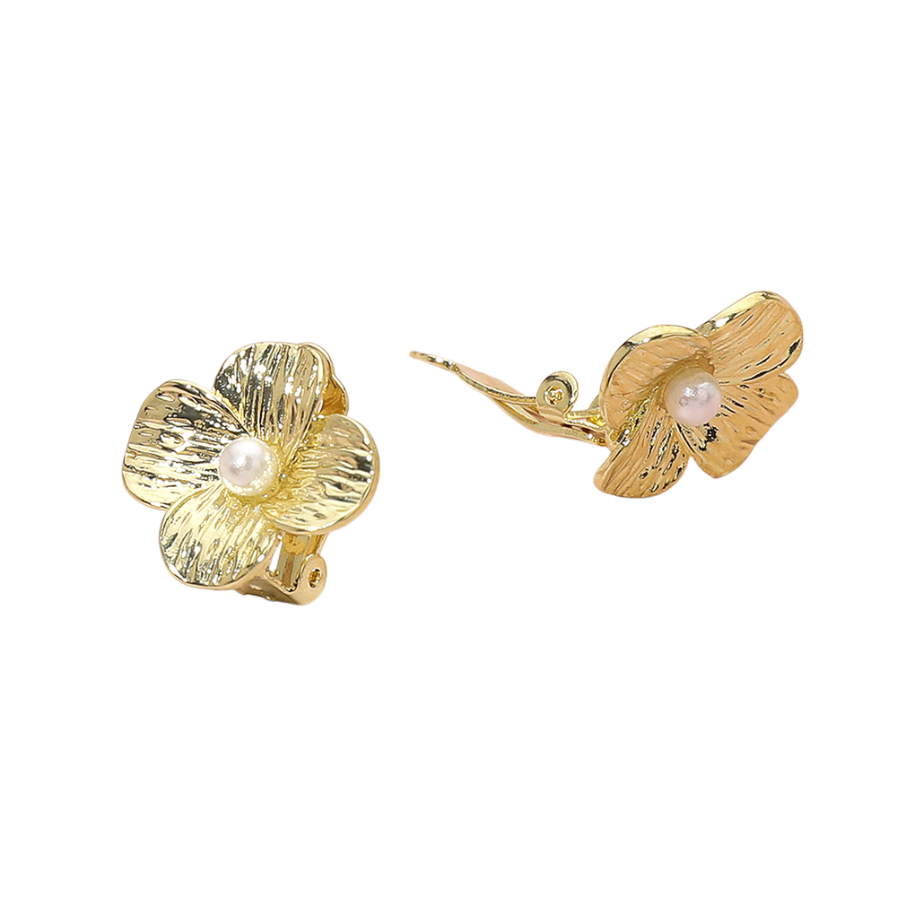 Details • Size : 0.75" X 0.75" • Clip On • Embrace timeless charm with these textured floral clip-on earrings, featuring softly sculpted petals and a luminous pearl center. Designed for comfort and sophistication, they add an elegant touch to any outfit, perfect for both casual gatherings and formal occasions. • Lead and Nickel Compliant