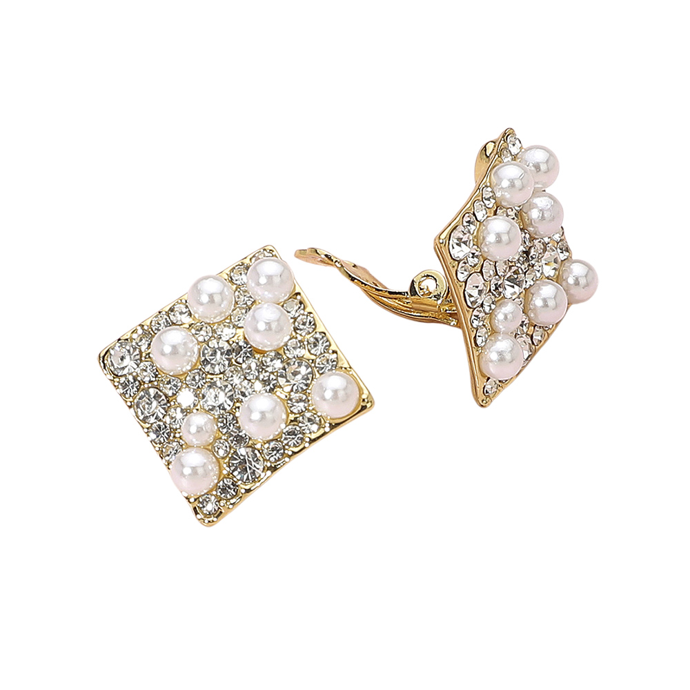 Details • Size : 0.9" X 0.9" • Clip On • Add a touch of glamour with these square pearl and crystal clip-on earrings. Designed with a modern geometric shape and a radiant mix of lustrous accents, they bring sophistication and sparkle to any outfit. Ideal for special occasions or elevating your everyday ensemble. • Lead and Nickel Compliant
