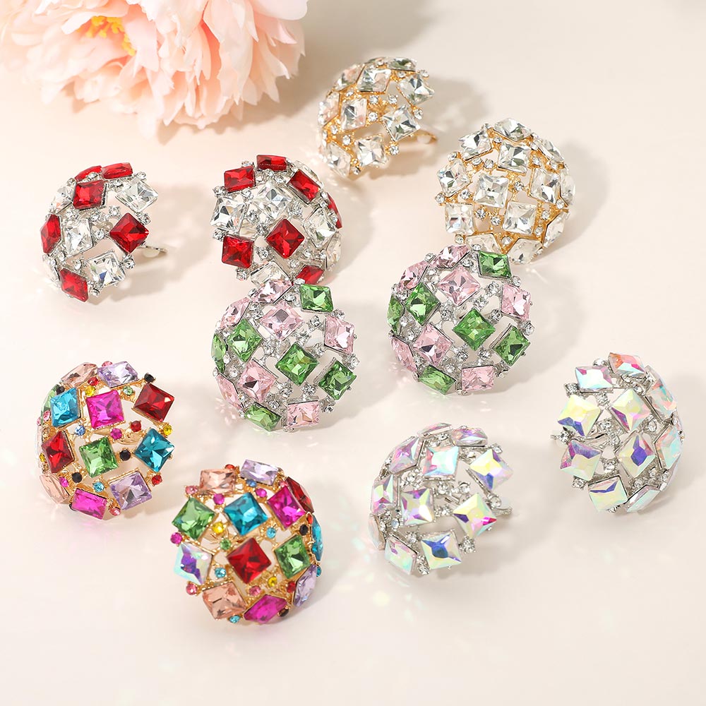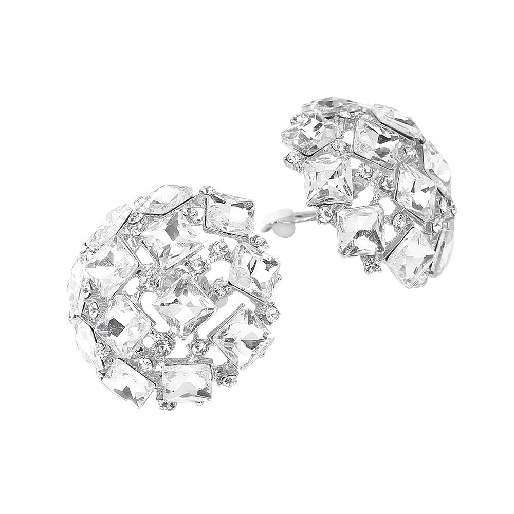 Details • Size : 1.5" X 1.5" • Clip On • Eye-catching rhinestone dome stud earrings with multi-faceted sparkle. Perfect for statement looks, parties, or adding glam to any outfit. Lightweight and comfortable to wear all day. • Lead and Nickel Compliant