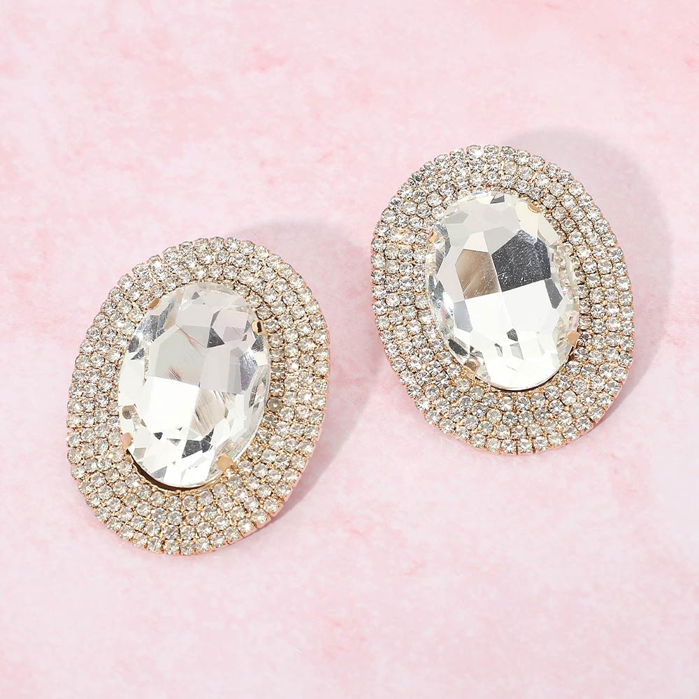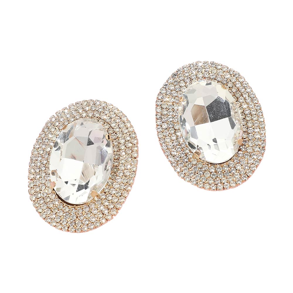Details • Size : 1.4" X 1.75" • Post Back • These oval halo statement stud earrings feature a bold faceted center framed by shimmering accents that reflect light with every movement. Designed to add instant polish, they elevate everyday outfits and special occasion looks alike. The classic stud silhouette offers comfortable wear while delivering standout sparkle, making them ideal for parties, events, or refined glamour styling. • Lead and Nickel Compliant
