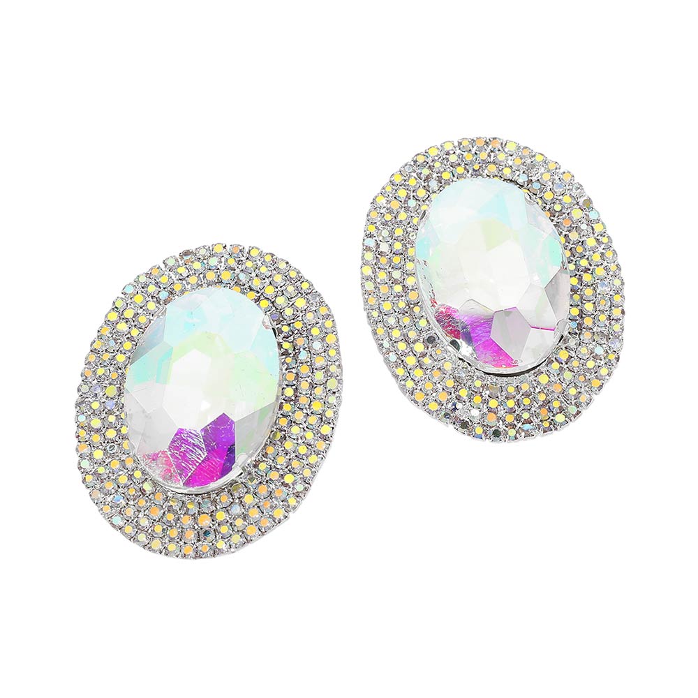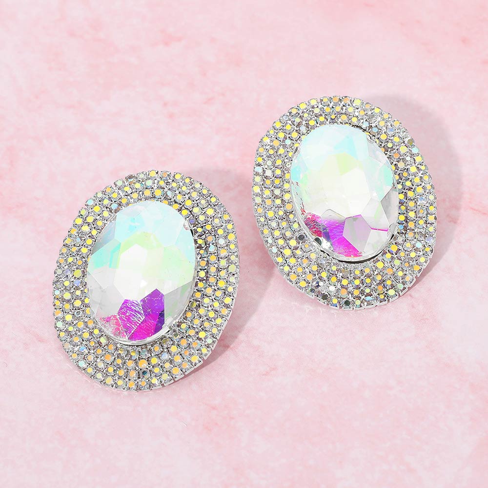 Details • Size : 1.4" X 1.75" • Post Back • These oval halo statement stud earrings feature a bold faceted center framed by shimmering accents that reflect light with every movement. Designed to add instant polish, they elevate everyday outfits and special occasion looks alike. The classic stud silhouette offers comfortable wear while delivering standout sparkle, making them ideal for parties, events, or refined glamour styling. • Lead and Nickel Compliant