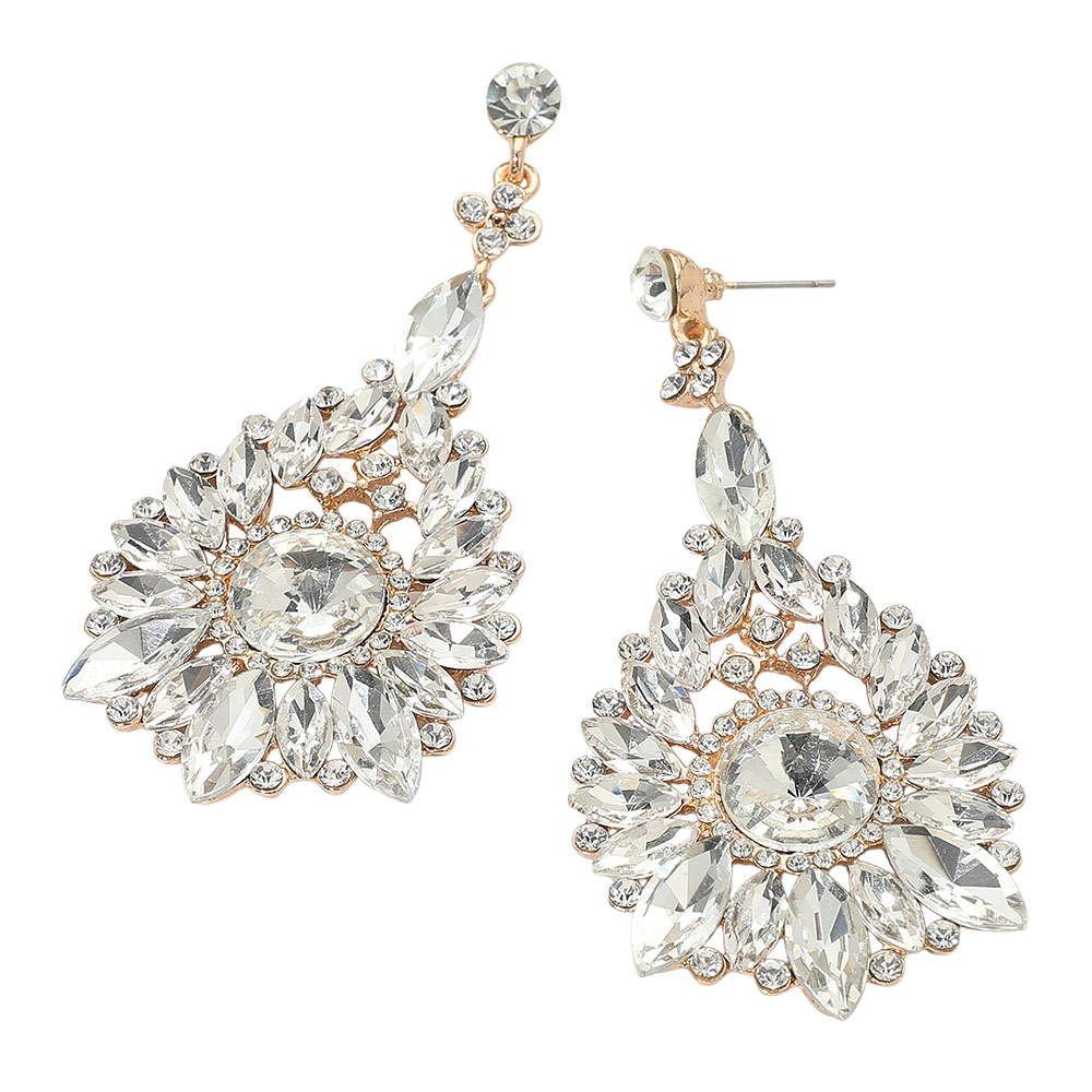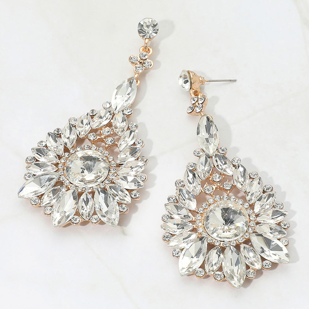 • Make an unforgettable impression with these statement teardrop crystal earrings. Designed with intricate faceted stones in a radiant arrangement, they capture light beautifully for a luxurious look—perfect for evening events, weddings, and glamorous nights out.