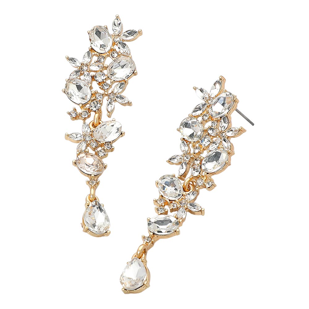 Details • Size : 0.8" X 2.7" • Post Back • These floral gem cluster drop earrings feature a graceful arrangement of marquise and oval-cut stones, creating a cascading botanical-inspired design. Perfect for evening wear or special occasions, they bring elegance and sparkle to any outfit with their intricate detailing and refined charm. • Lead and Nickel Compliant