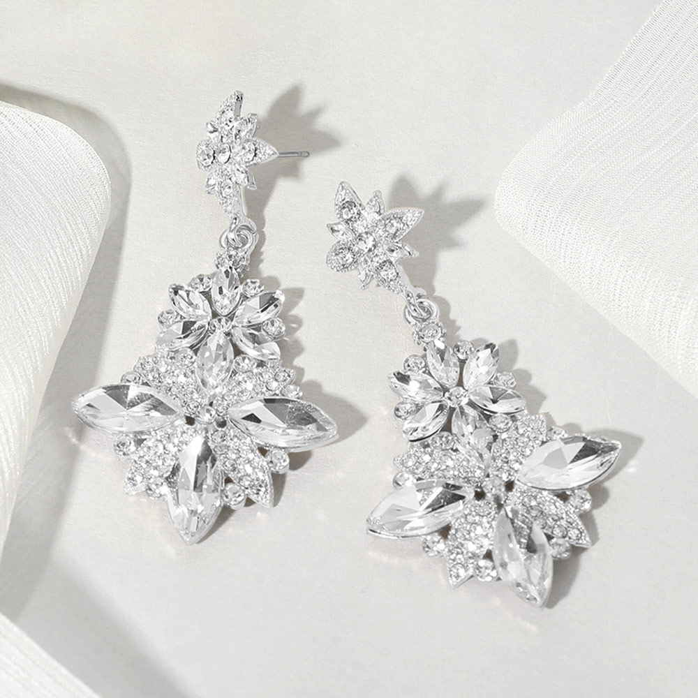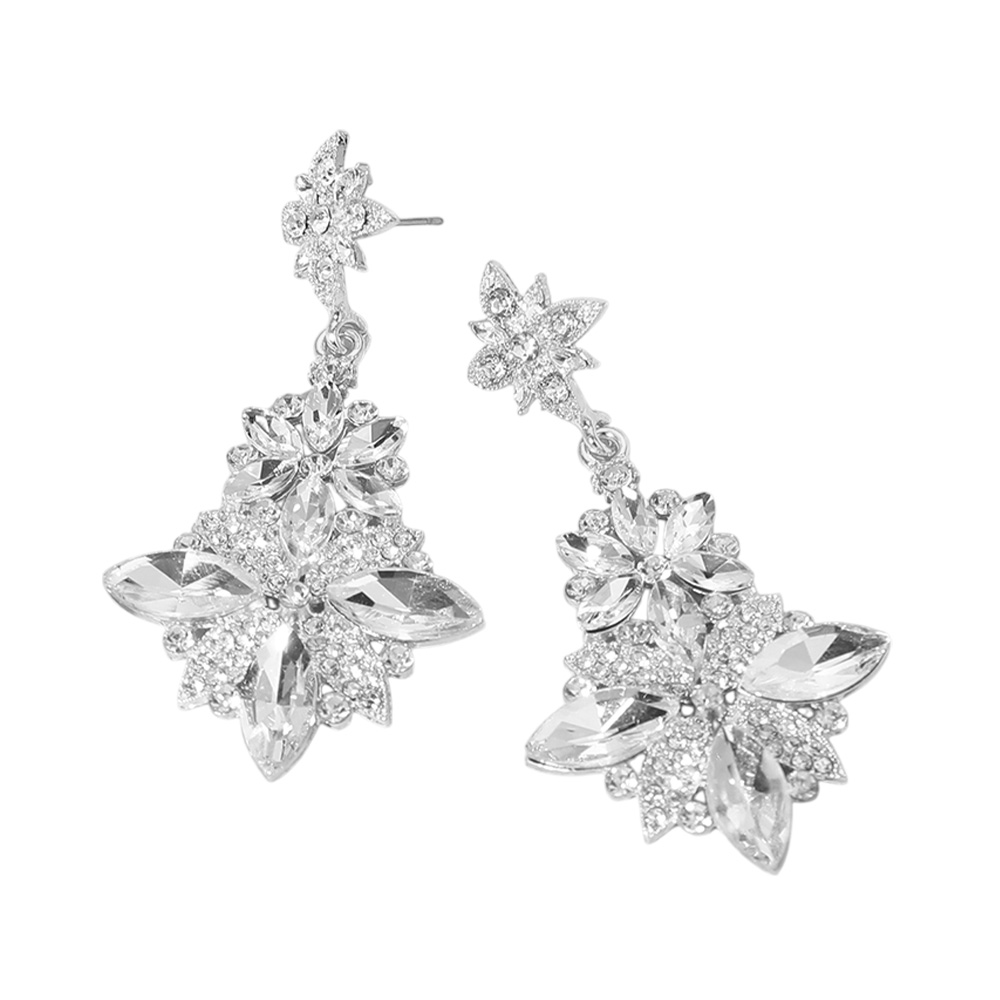 Details • Size : 1.4" X 2.75" • Post Back • Radiate elegance with these floral crystal drop earrings featuring a stunning cluster of faceted stones in a dazzling flower design. Ideal for weddings, galas, or celebrations, these statement earrings add a glamorous finishing touch to elevate your evening or bridal look. • Lead and Nickel Compliant
