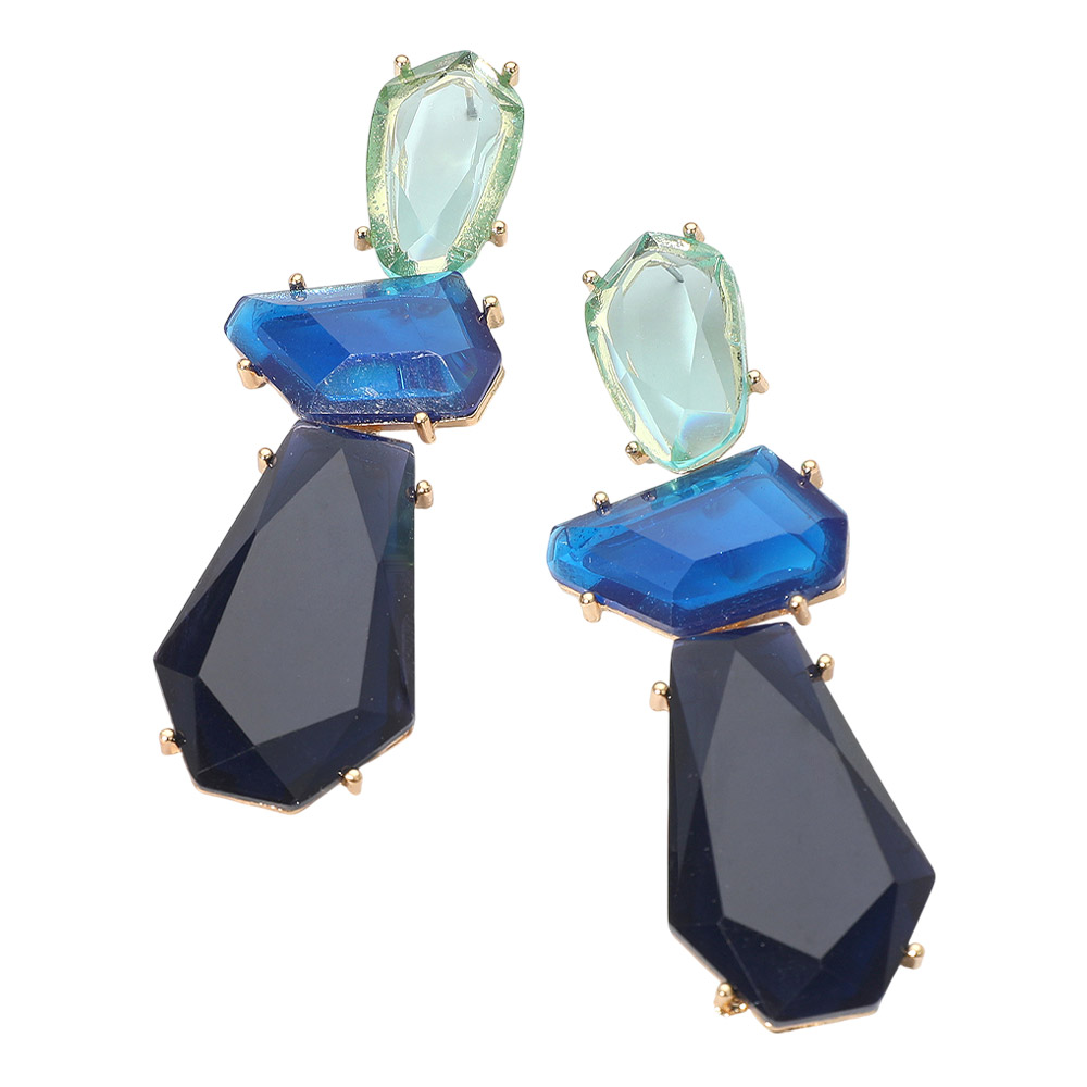 • Make a bold statement with these geometric three-stone drop earrings. Featuring an artful mix of faceted stones in a modern tiered design, they capture light beautifully for an effortlessly elegant look. Perfect for adding sophistication and drama to any outfit.