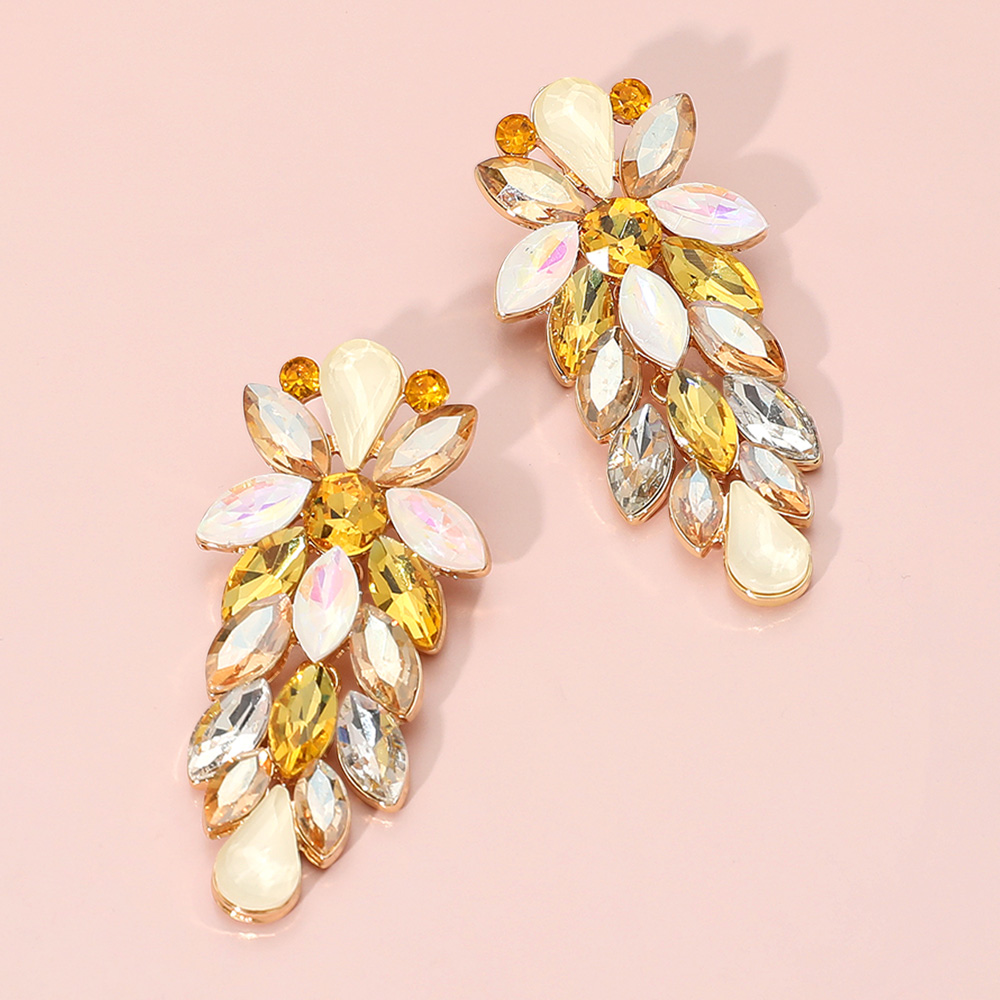 Details • Size : 1.2" X 2.4" • Post Back • Make every look unforgettable with these radiant leaf-cluster statement earrings designed to capture light beautifully. Their intricate arrangement adds a glamorous touch, perfect for special occasions, evening outfits, or elevating everyday style with bold, eye-catching sparkle. • Lead and Nickel Compliant