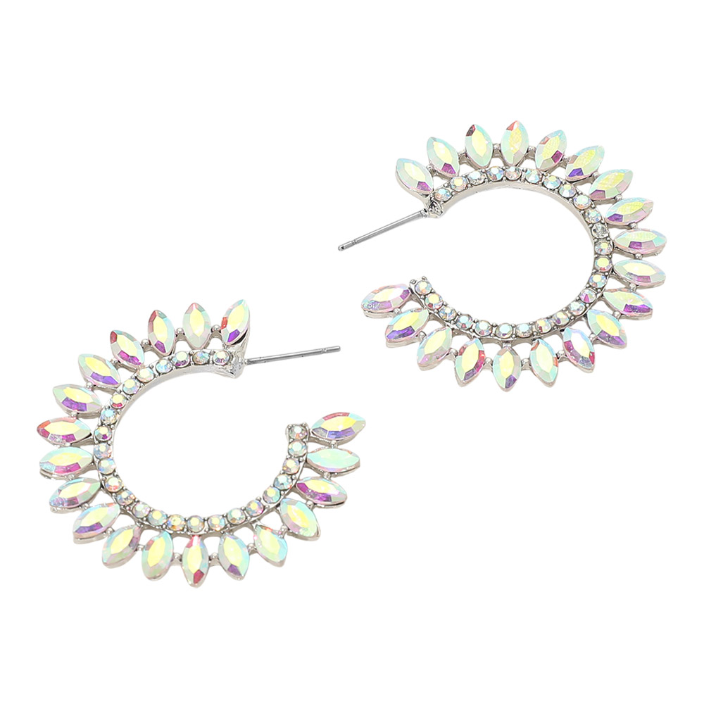 • These crystal leaf hoop statement earrings feature a bold open-hoop silhouette accented with marquise-shaped stones arranged in a radiant leaf pattern. Designed to add sparkle and dimension, they are perfect for parties, special occasions, and elevated everyday styling. Lightweight yet eye-catching, they deliver modern elegance with standout appeal.