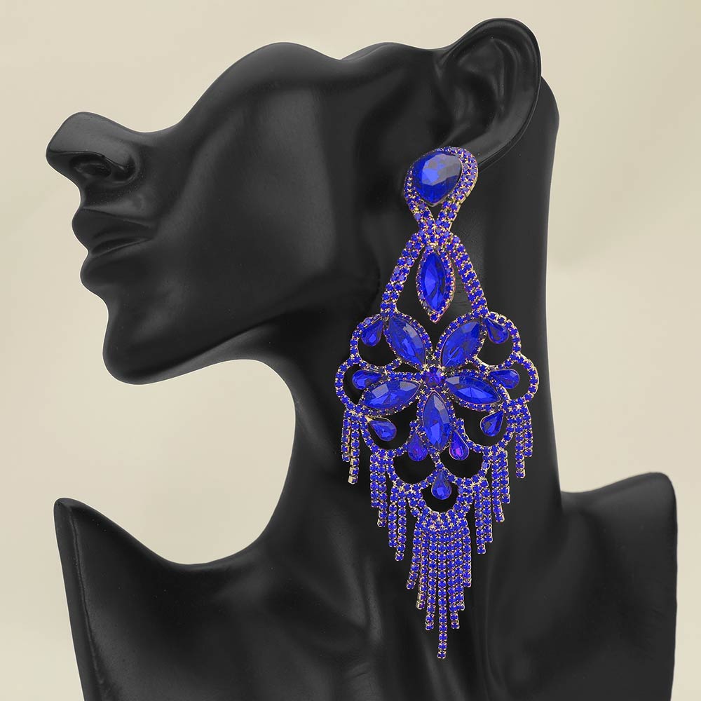 • These statement crystal fringe drop earrings feature an elegant elongated silhouette with layered detailing that creates eye-catching movement. Designed to elevate formal looks, parties, weddings, and special occasions, they offer a dramatic yet refined accent for evening wear, stage styling, and fashion-forward accessory collections.