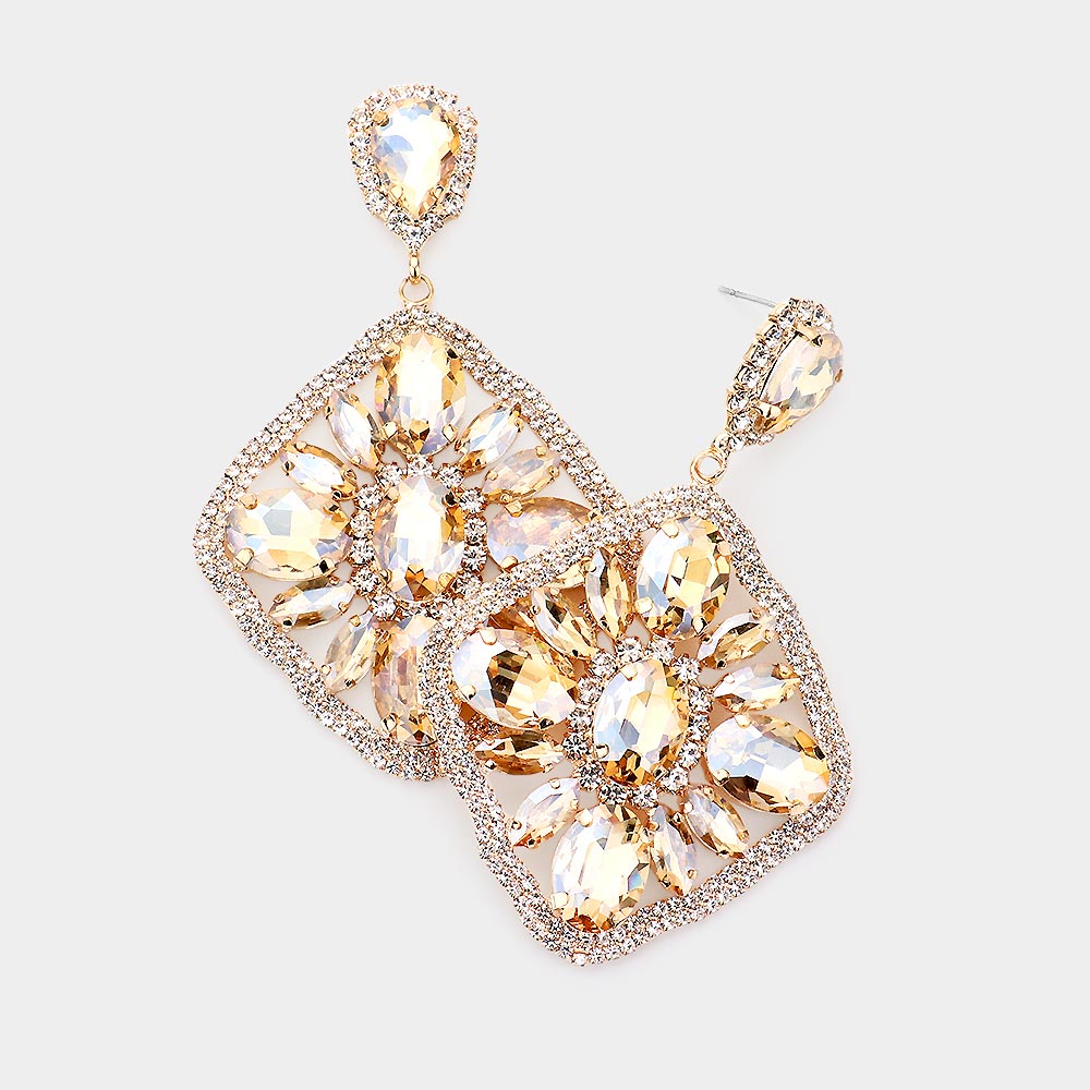 Oval Marquise Stone Cluster Accented Rhinestone Rhombus Dangle Evening Earrings