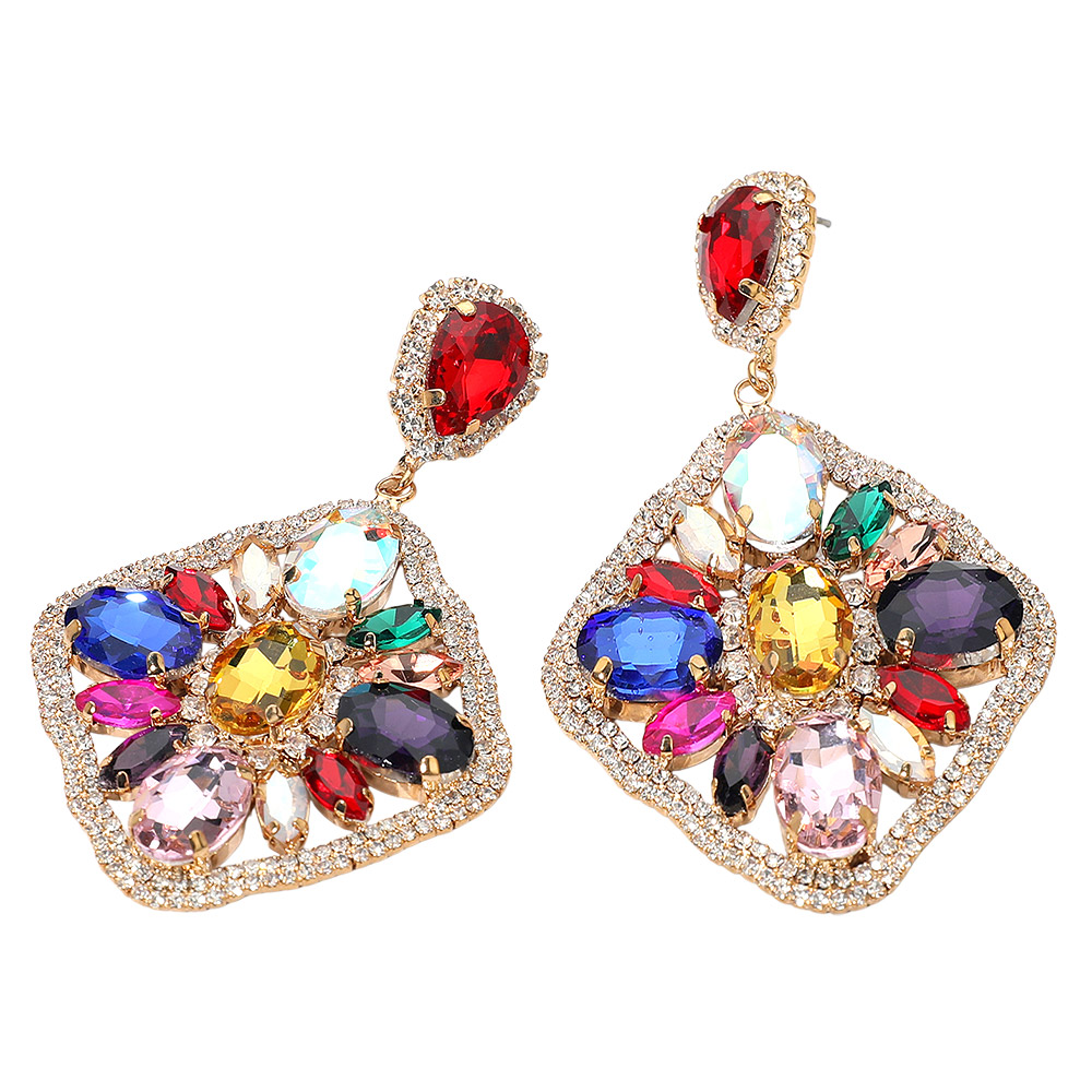 • Make a dazzling impression with these vibrant gemstone statement earrings. Designed with a radiant mix of sparkling stones, they capture luxury and confidence in every detail—perfect for parties, weddings, or elevating your everyday style with striking sophistication.