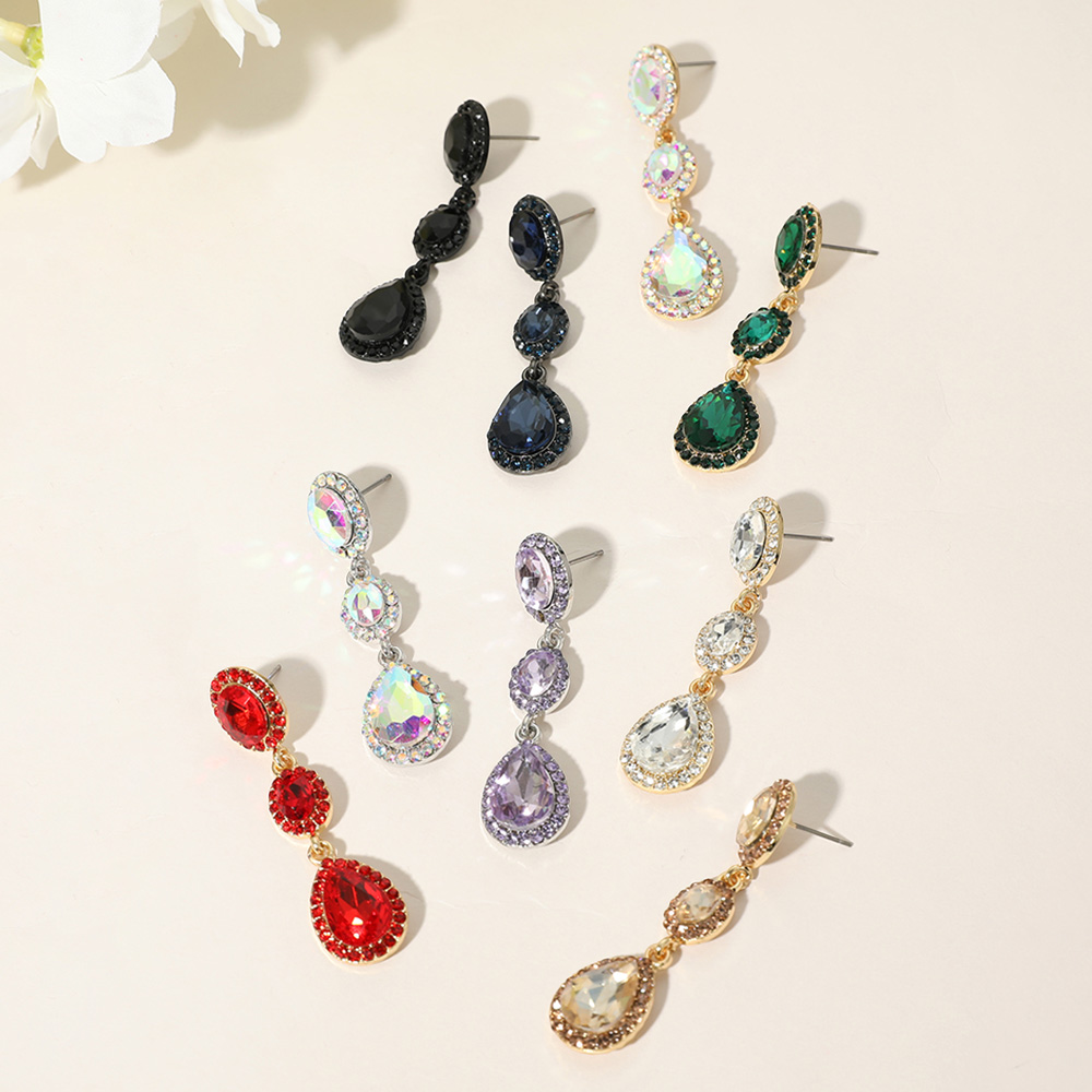 • Shine bright with these triple teardrop crystal drop earrings featuring dazzling stones in a cascading design. Perfect for weddings, galas, or nights out, they add refined sparkle and timeless elegance to any outfit, effortlessly elevating your look with radiant sophistication.