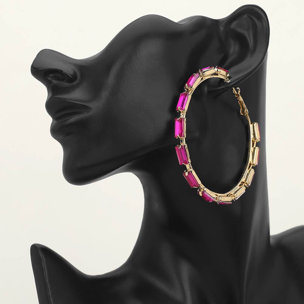 Details • Size : 2.75" X 2.75" • Omega Closure • Bold statement hoop earrings featuring a sleek baguette-inspired silhouette that adds structure and shine to any look. Designed for trend-forward styling, these hoops elevate everyday outfits, evening wear, and boutique collections with a confident, fashion-focused edge. • Lead and Nickel Compliant
