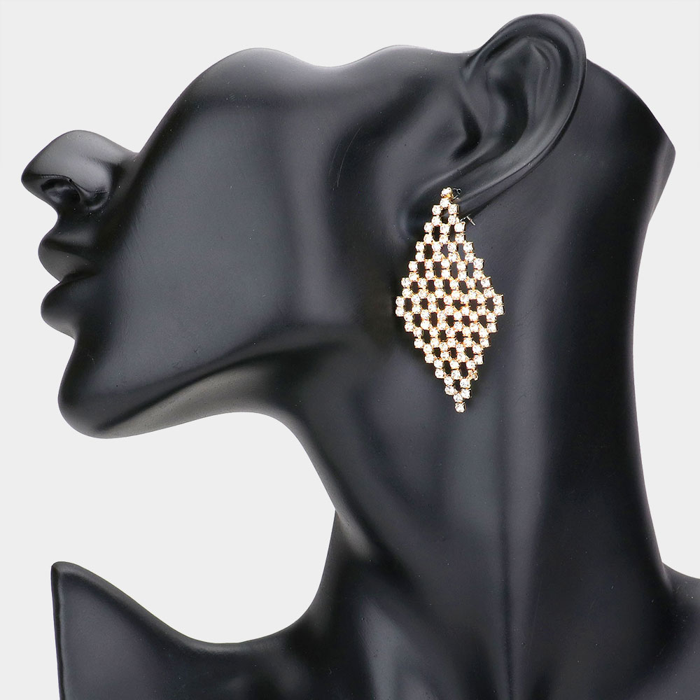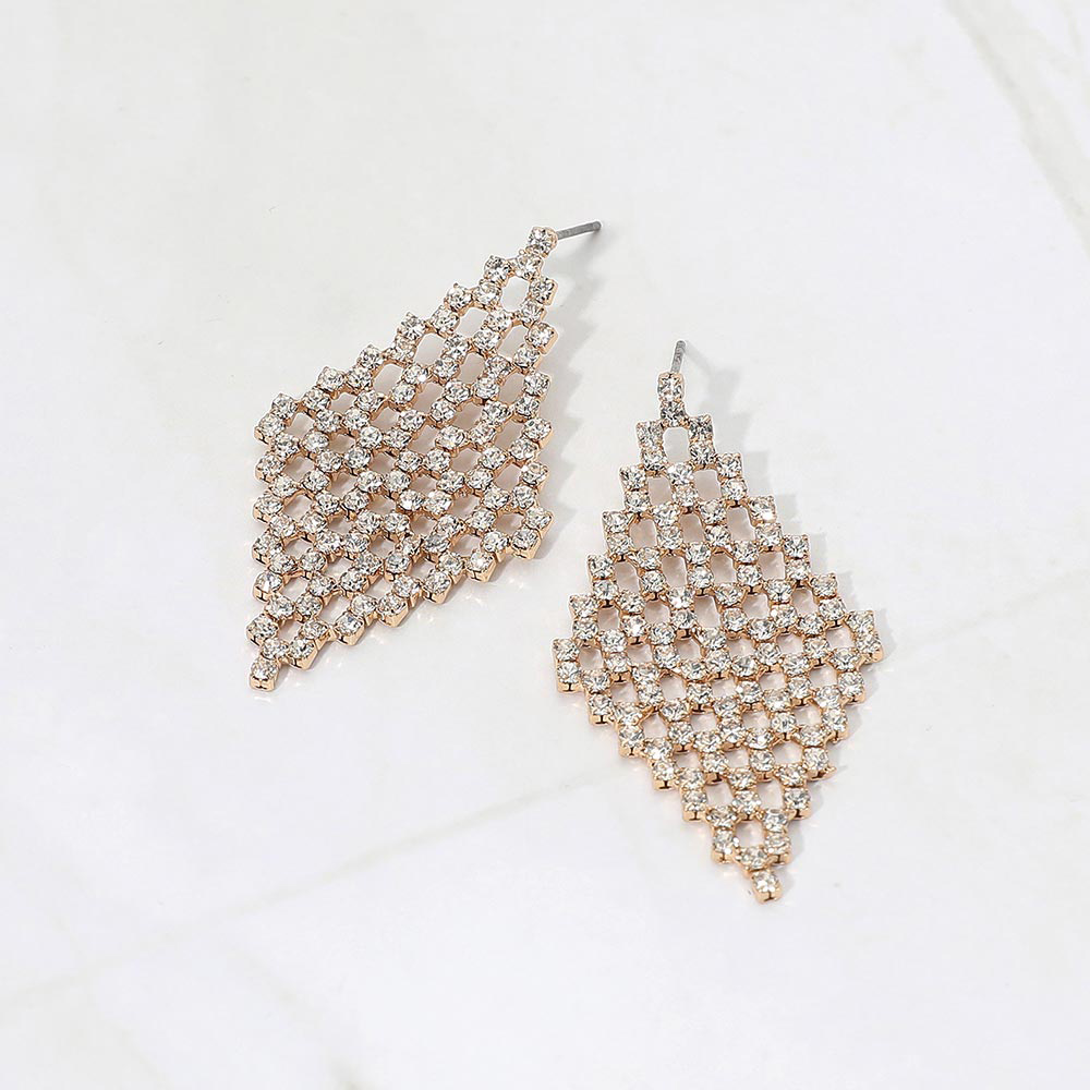 Details • Size : 1" X 2" • Post Back • Statement drop earrings featuring a bold diamond-shaped lattice design that creates eye-catching sparkle and movement. A modern, elegant silhouette ideal for evening wear, parties, and special occasions, designed to elevate outfits while offering standout appeal for trend-focused jewelry collections and boutique displays. • Lead and Nickel Compliant