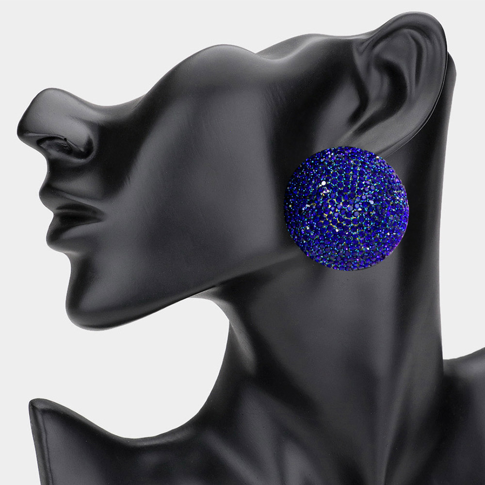 Details • Size : 1.75" X 1.75" • Post Back • These bold round statement earrings shimmer with countless crystals, creating a dazzling and sophisticated look. Perfect for special occasions or evening wear, their striking design captures attention effortlessly, adding a glamorous touch to any outfit with timeless elegance. • Lead and Nickel Compliant