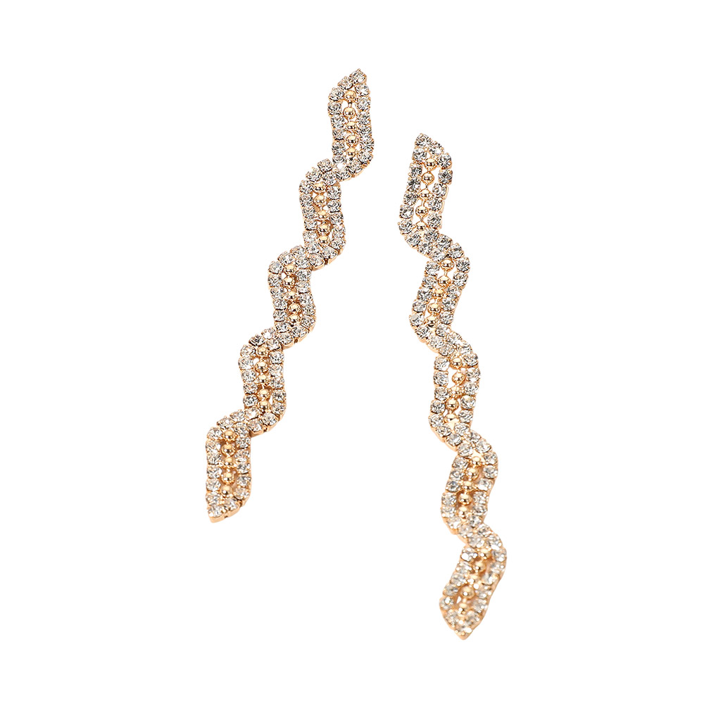 Details • Size : 0.25" X 3.4" • Post Back • These wavy crystal statement drop earrings feature a unique zigzag silhouette encrusted with brilliant stones that shimmer beautifully from every angle. Perfect for evening wear, galas, or special occasions, they add a dazzling modern touch of glamour to any sophisticated look. • Lead and Nickel Compliant