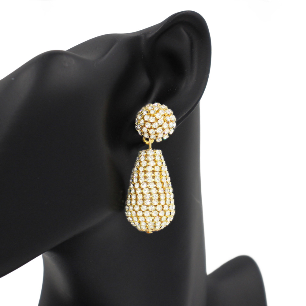 Details • Size : 0.75" X 2.1" • Post Back • Elegant teardrop crystal ball earrings with dazzling pave detailing. Designed to catch the light, these statement drop earrings are perfect for evening wear, weddings, or parties, adding sophistication and sparkle to any outfit with their bold and glamorous design. • Lead and Nickel Compliant