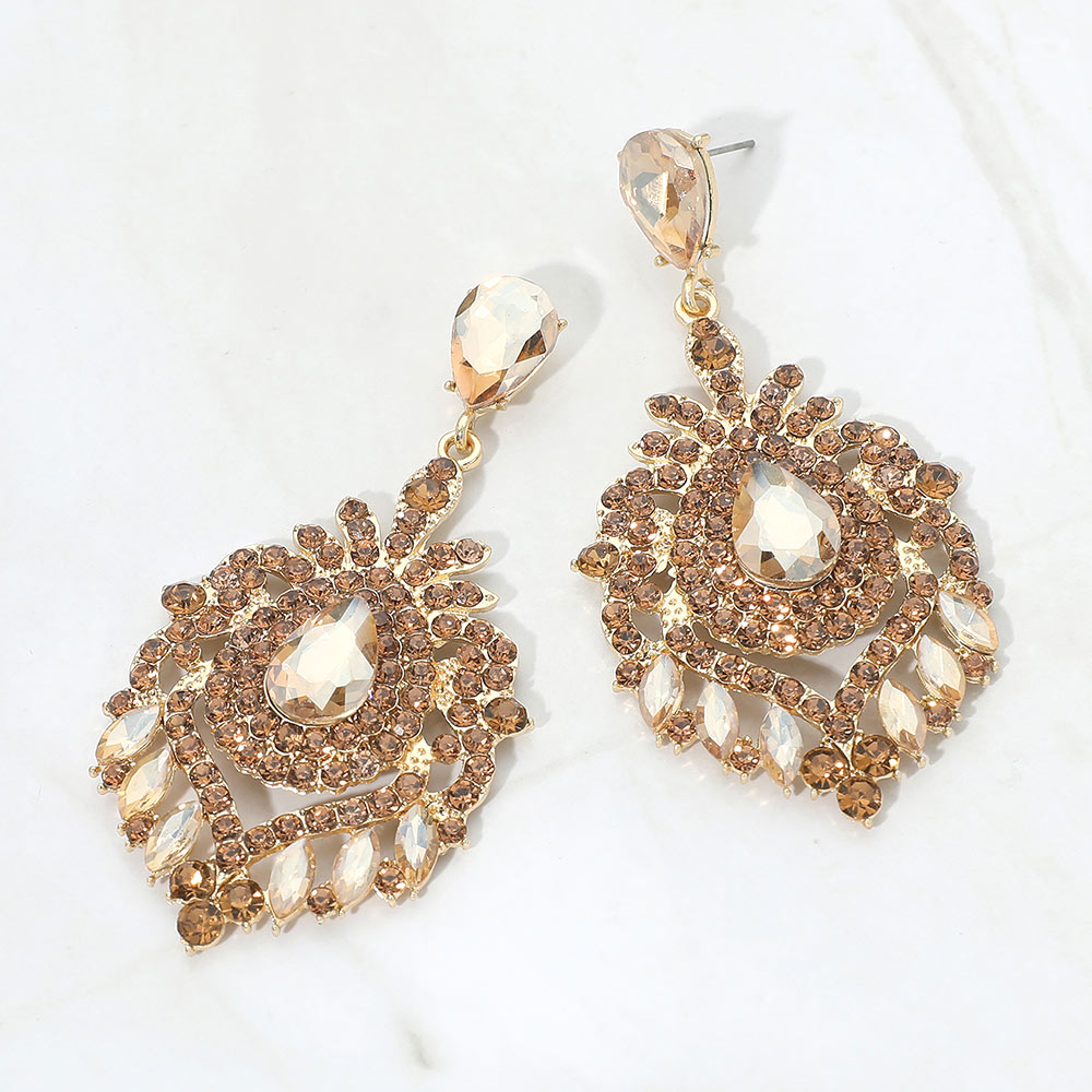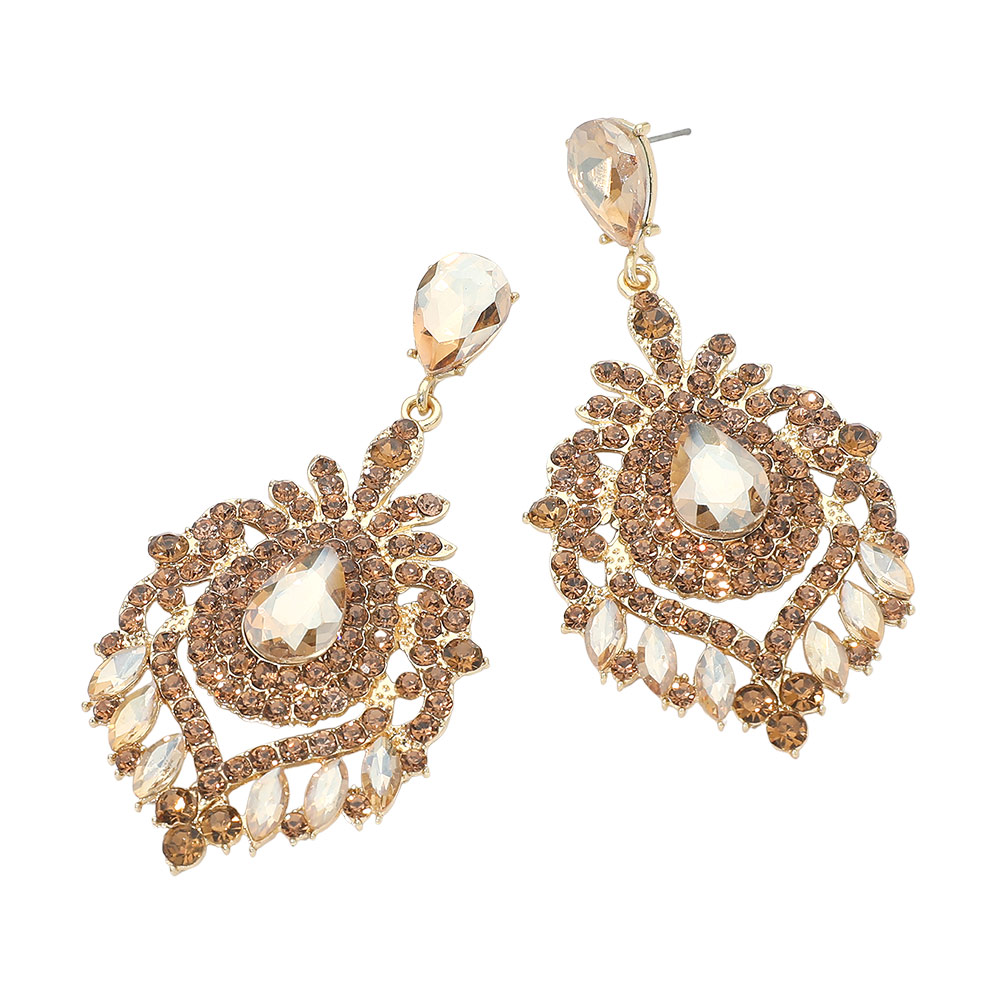 • These statement crystal drop chandelier earrings feature an intricate layered design with faceted accents that catch the light from every angle. Designed to elevate evening looks, weddings, and special events, they add bold sparkle and refined glamour while remaining comfortable to wear. A striking accessory that instantly enhances dresses, formal outfits, or party-ready styles.