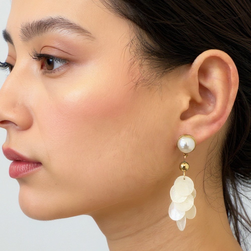 Details • Size : 0.75" X 2" • Post Back • These drop earrings combine luminous shell-like discs with a pearl stud and sparkling crystal accents for a statement-making design. Elegant yet playful, they bring texture and shine, perfect for adding a touch of modern charm to both day looks and evening outfits. • Lead and Nickel Compliant • Hypoallergenic • Made In Korea • Gold Dipped • Brass
