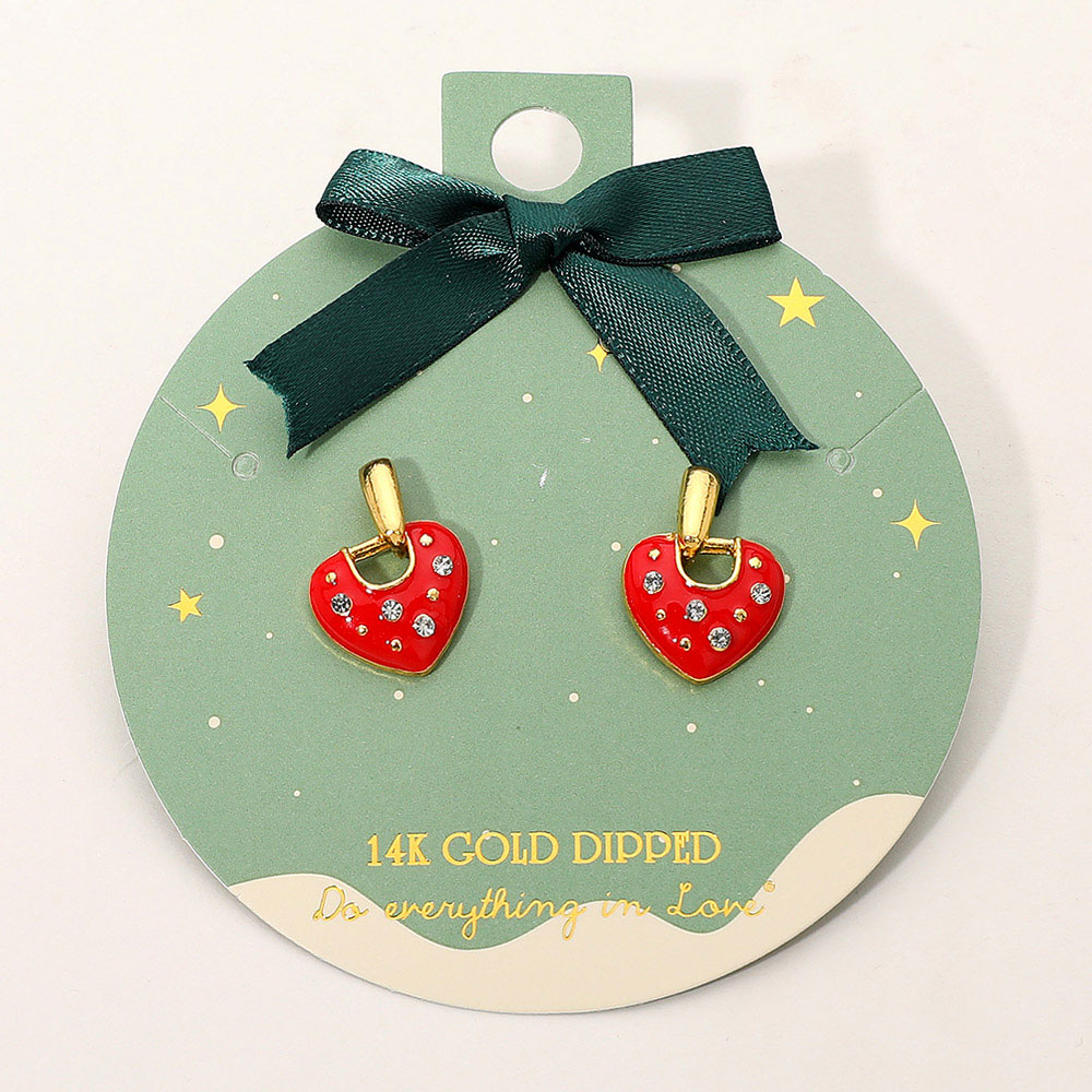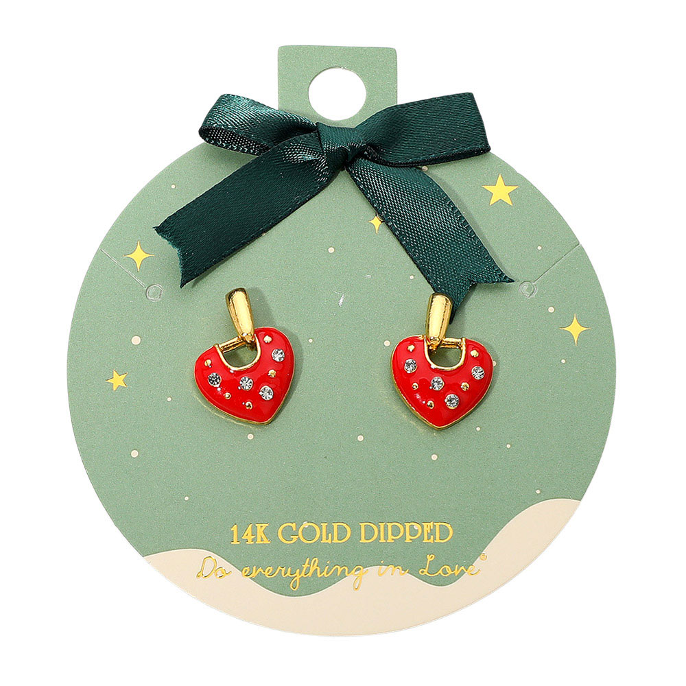 Details • Size : 0.6" X 0.8" • Post Back • Playful heart charm drop earrings embellished with sparkling accents for a sweet, eye-catching finish. Their petite size and festive design make them ideal for gifting, seasonal outfits, everyday wear, or adding a fun romantic touch to any look. Perfect for holiday styling and special moments. • Gold Dipped • Hypoallergenic • Lead and Nickel Compliant • Made In Korea