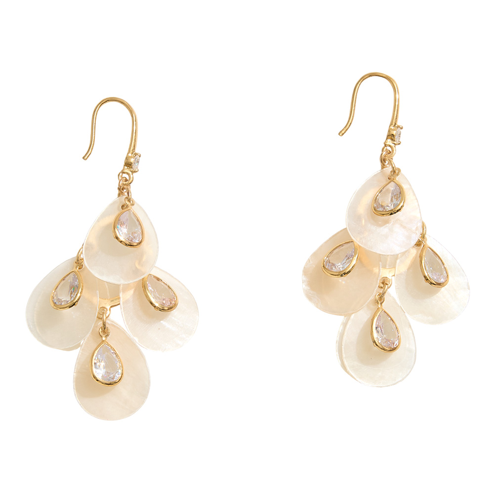 Details • Size : 1.2" X 2.5" • Fish Hook Back • These teardrop shell chandelier earrings dazzle with layered drops adorned by sparkling crystal accents. Light-catching and elegant, they bring a touch of beachy sophistication to evening looks, resort wear, or any outfit needing a statement piece with natural charm. • Brass • CZ Cubic Zirconia • Gold Dipped • Hypoallergenic • Lead and Nickel Compliant • Made In Korea