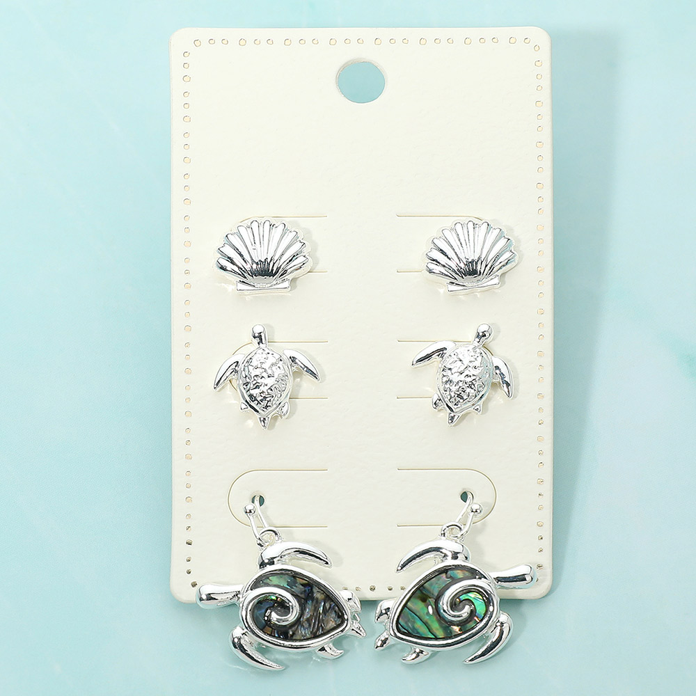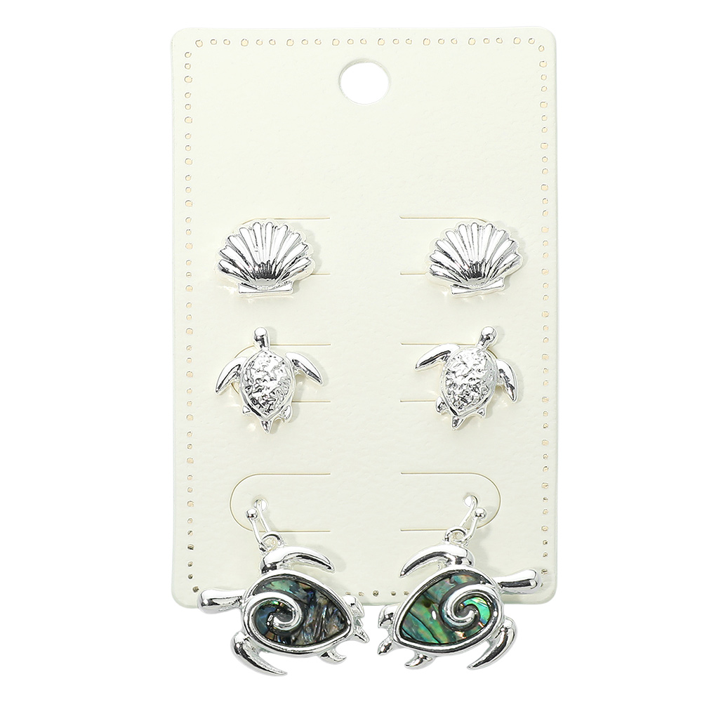 Details • Size : 0.3" - 1.25" L • Post Back, Fish Hook Back • Sea-inspired three-pair earring set featuring shell studs, detailed turtle studs, and dangling turtle designs with textured accents. Designed for mix-and-match styling, this versatile set is ideal for everyday wear, beach themes, travel looks, and seasonal collections, adding playful coastal charm and variety to accessory assortments. • Lead and Nickel Compliant