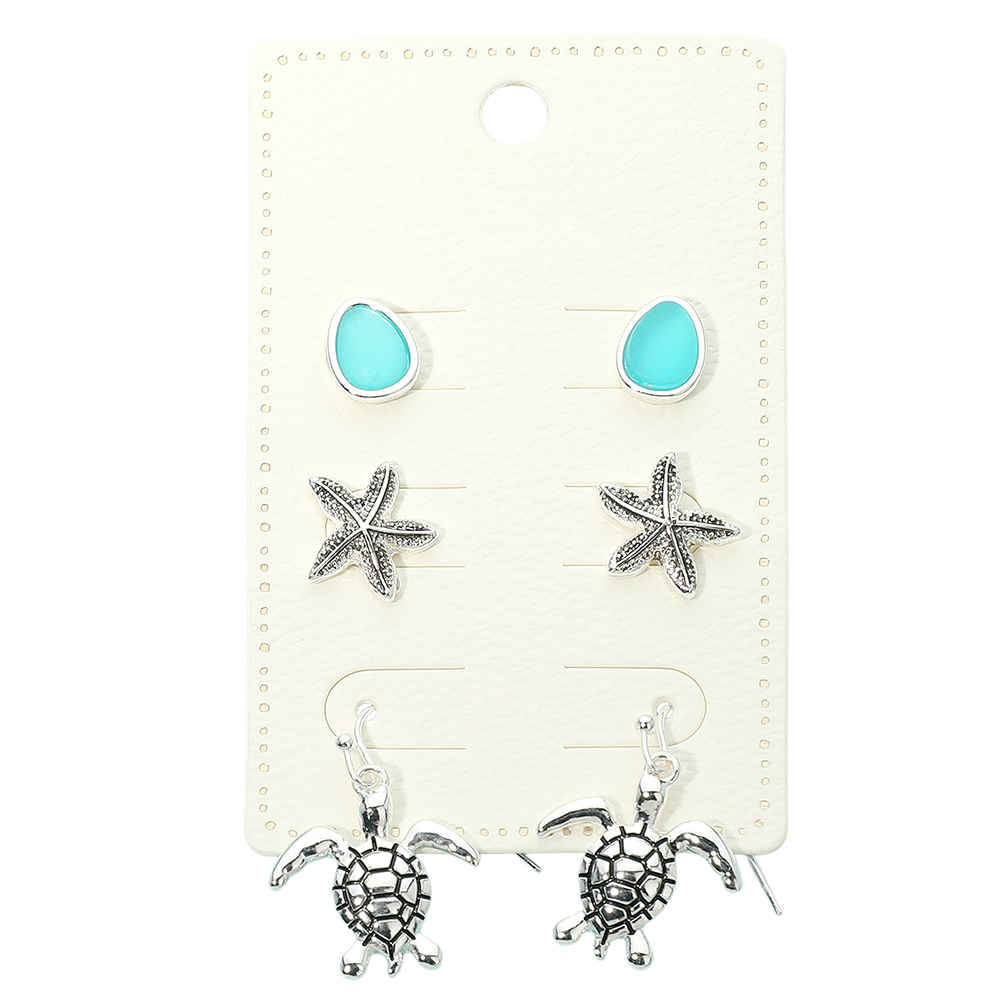 3Pairs - Sea Glass Metal Starfish Stud Turtle Drop Dangle Earring Set 3Pairs - Sea Glass Metal Starfish Stud Turtle Drop Dangle Earring Set