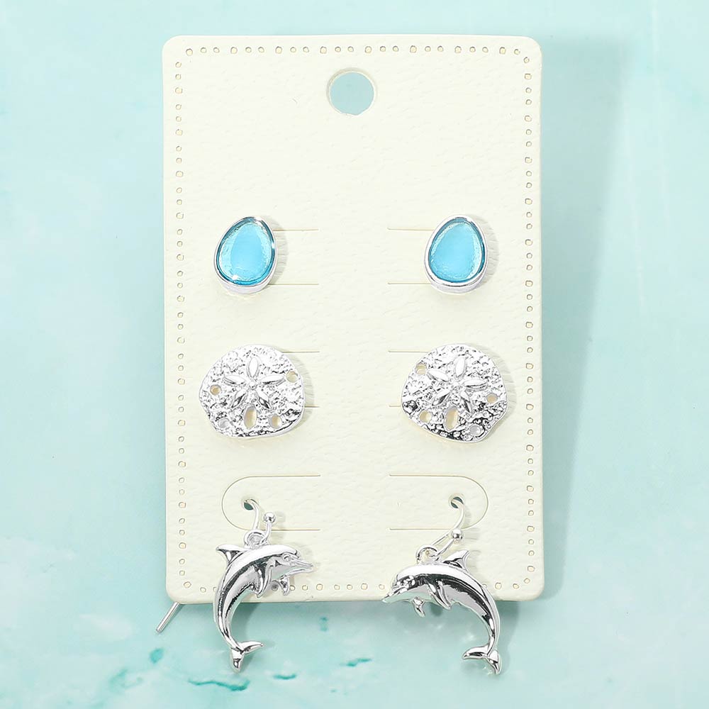 Details • Size : 0.4" - 1.24" L • Post Back / Fish Hook Back • This stud earring set includes three distinct designs featuring smooth teardrop studs, textured round studs, and playful dolphin charm drops. Designed for easy mix-and-match styling, this versatile set adds variety to everyday looks and makes a great choice for gift shops, resort collections, and ocean-inspired seasonal assortments. • Lead and Nickel Compliant