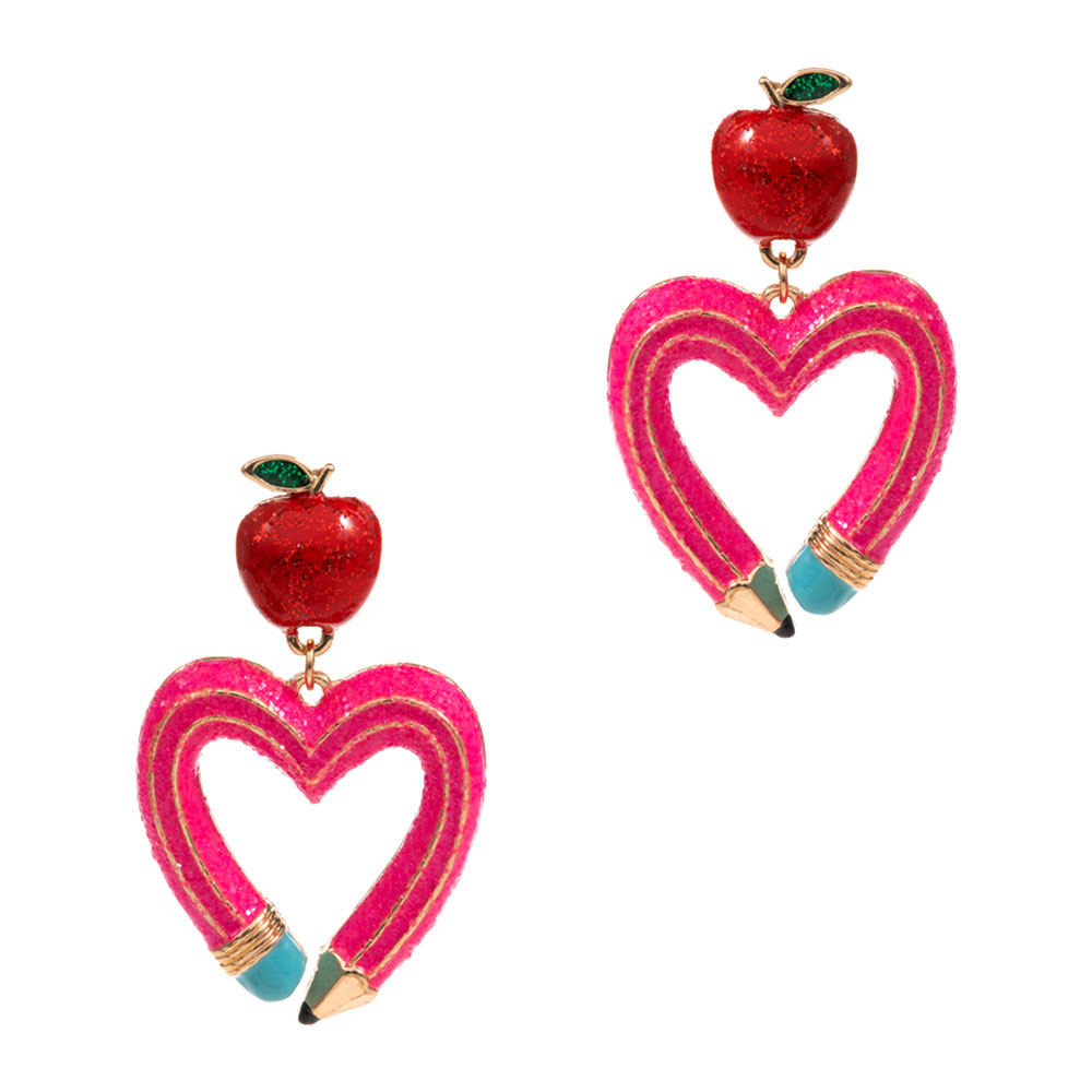 Details • Size : 1.2" X 1.75" • Titanium Post Back • Playful drop earrings featuring an apple charm paired with a heart-shaped pencil design for a school-inspired statement. Lightweight and fun, they elevate casual looks, themed outfits, classroom events, or gift ideas while remaining comfortable for all-day wear. • Lead and Nickel Compliant • Hypoallergenic