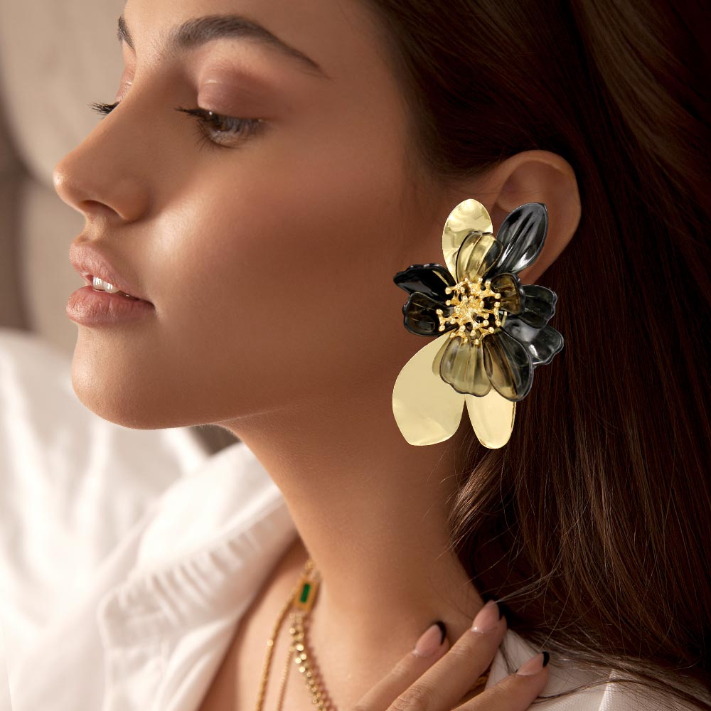 • Bold floral drop earrings designed with layered petal shapes and sculptural details for standout fashion styling. Ideal for boutiques, seasonal displays, special occasions, and statement looks, these earrings add dimension and elegance to both casual and dressy outfits.