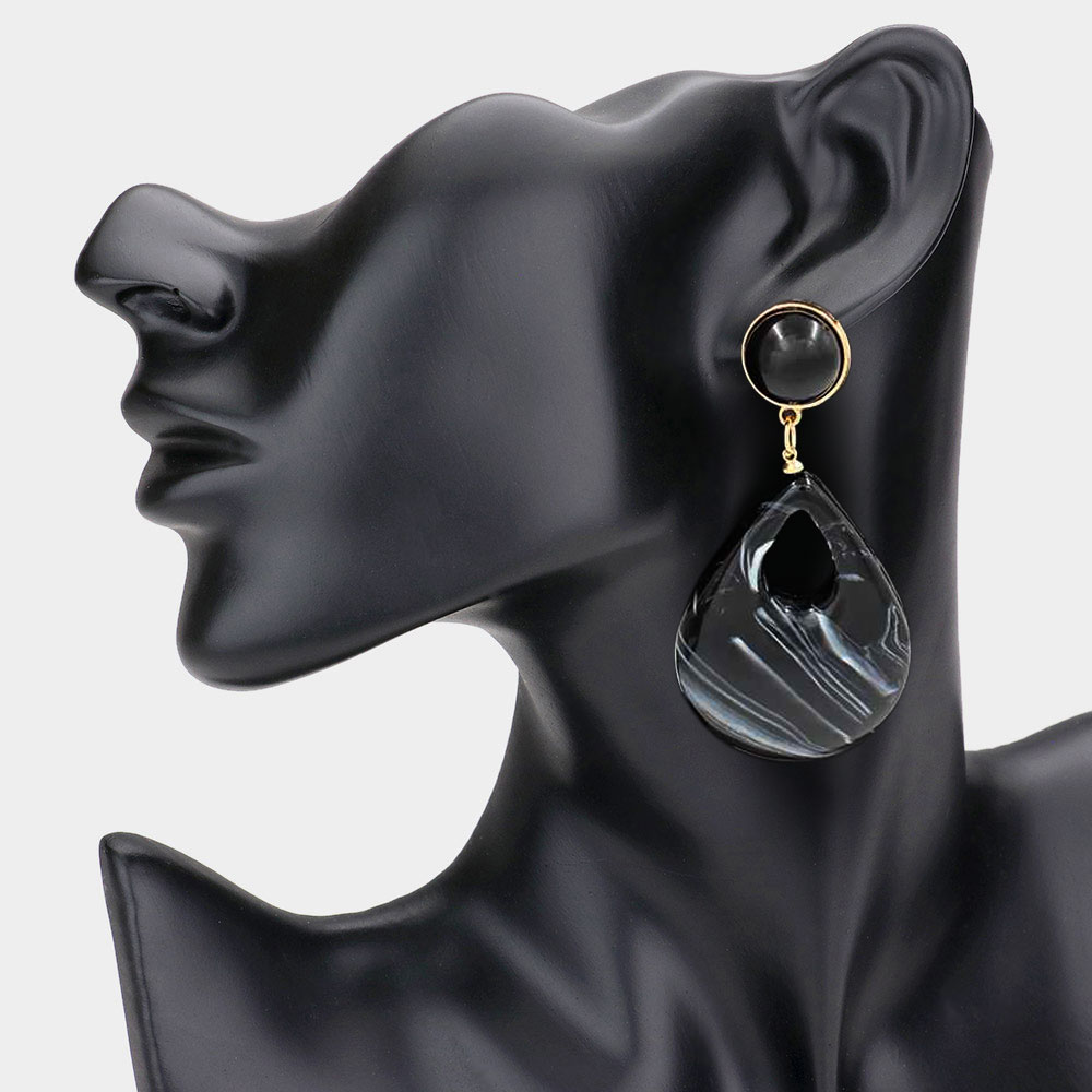 Details • Size : 1.6" X 3.25" • Post Back • Stylish dangle earrings featuring a round stud with a teardrop-shaped cutout drop. A modern accessory that combines bold and elegant design, perfect for adding a statement touch to casual looks or enhancing evening outfits with chic sophistication. • Lead and Nickel Compliant