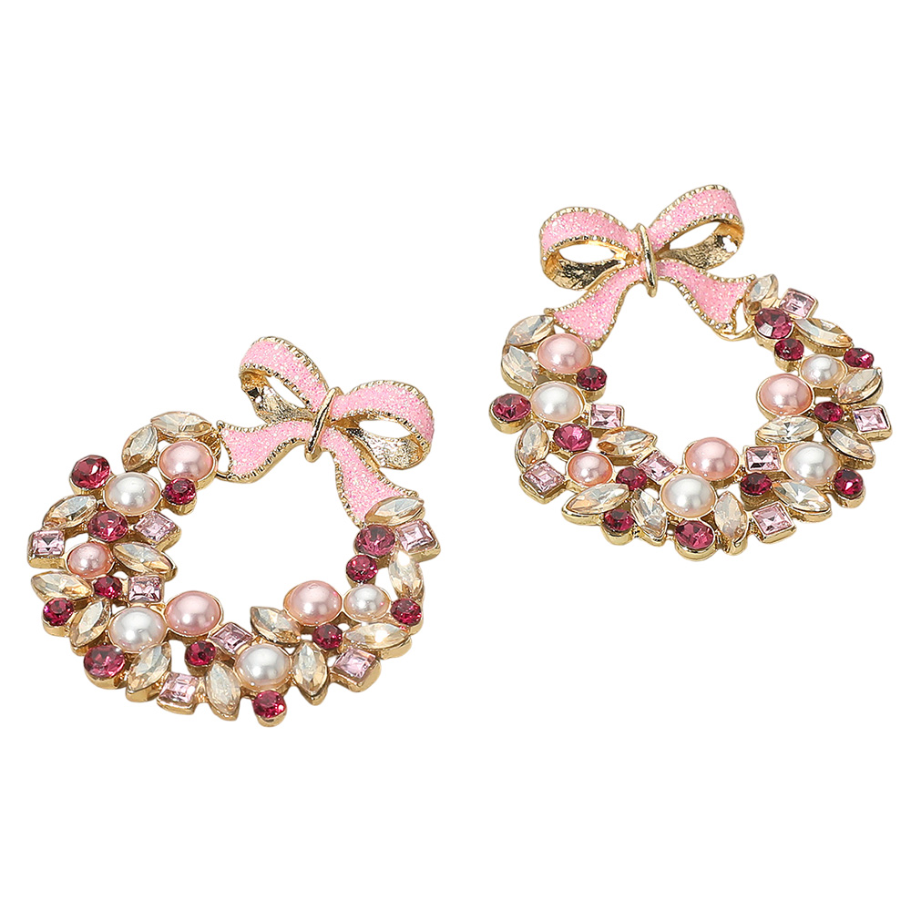 Details • Size : 1.7" X 1.8" • Post Back • Celebrate the season with these Christmas wreath earrings, featuring sparkling gems, pearl accents, and a glittering bow detail. A cheerful holiday accessory that adds festive charm to your outfit, perfect for parties, gatherings, and seasonal celebrations. • Lead and Nickel Compliant