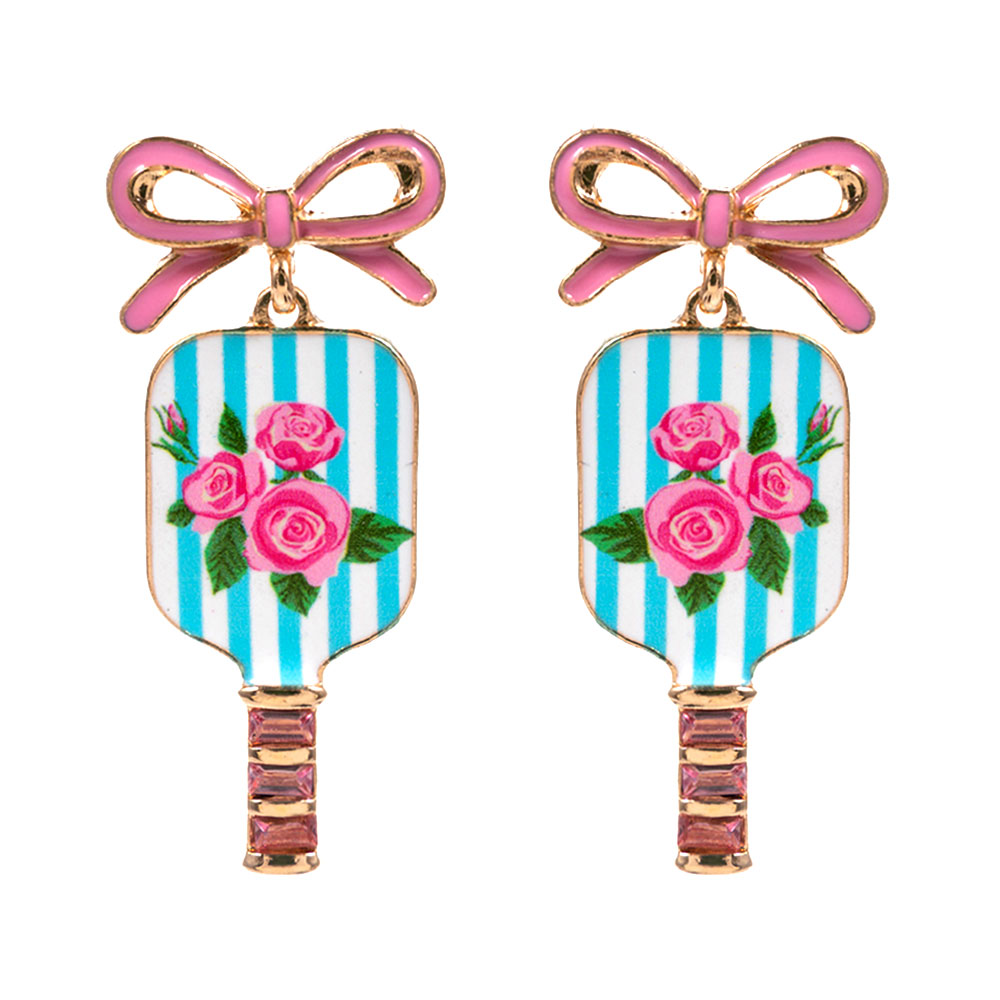 Details • Size : 0.8" X 1.75" • Post Back • These pickleball paddle drop earrings feature a charming bow accent and playful patterned design, adding a fun and sporty touch to any outfit. Perfect for everyday wear, gifting, or pickleball lovers, they bring personality and style to casual looks while remaining lightweight and easy to pair with seasonal accessories. • Lead and Nickel Compliant