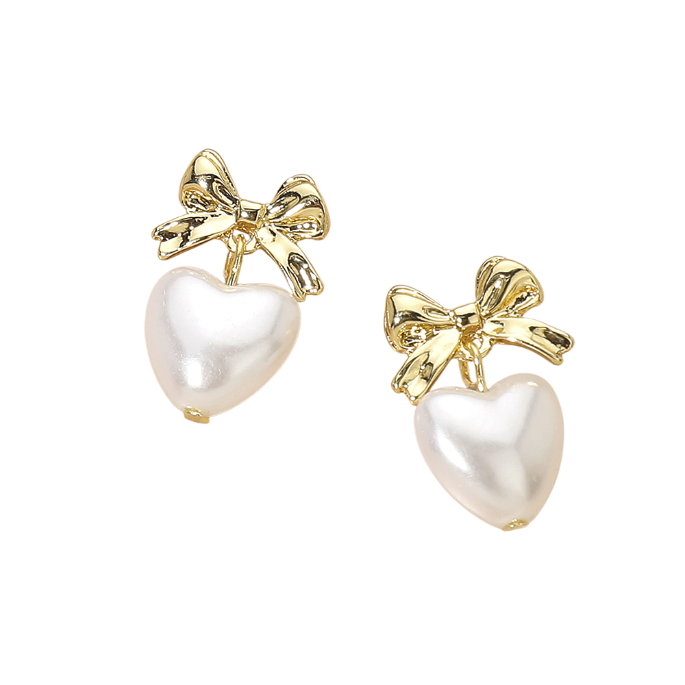 Details • Size : 0.75" X 0.8" • Post Back • Charming bow heart drop earrings designed to add a sweet yet polished accent to any look. Featuring a delicate bow detail with a softly rounded heart silhouette, this style is ideal for gifting, boutique displays, and everyday collections that highlight feminine appeal and timeless charm. • Lead and Nickel Compliant