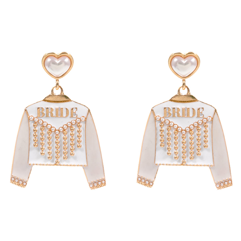 Details • Size : 1.5" X 2" • Titanium Post Back • Bold bride-themed statement earrings designed with a western-inspired jacket silhouette and heart stud detail. Ideal for bachelorette parties, bridal showers, engagement events, and western wedding celebrations. A standout accessory for photo moments, themed outfits, and curated bridal gift assortments. • Lead and Nickel Compliant • Hypoallergenic