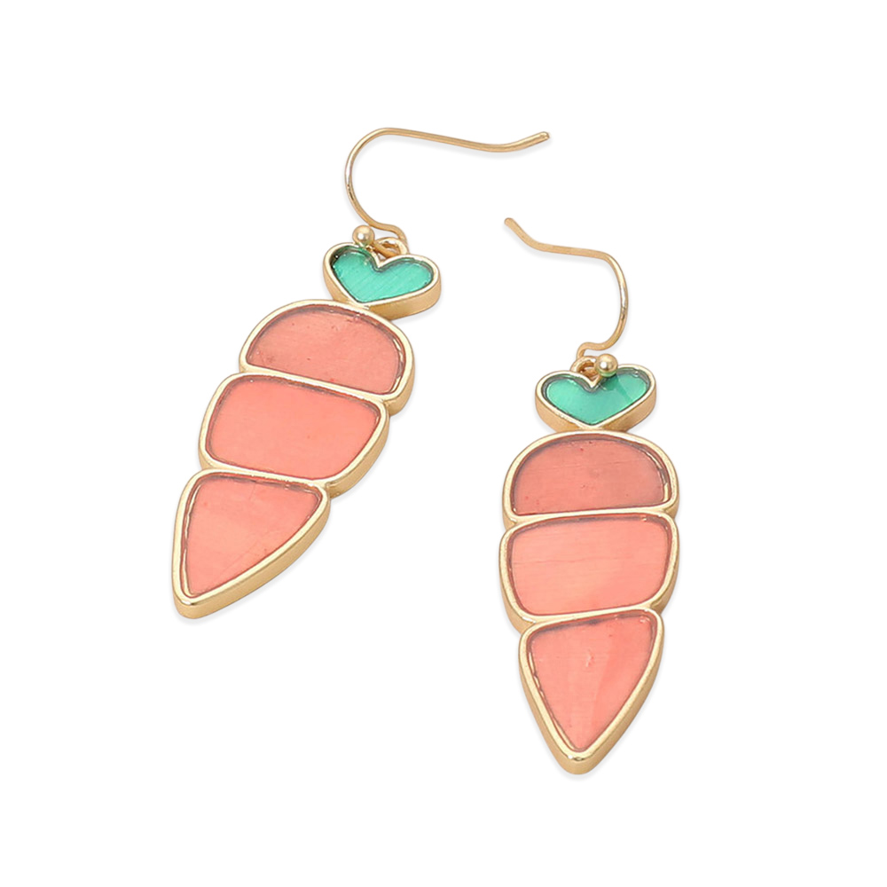 Details • Size : 0.6" X 2" • Fish Hook Back • These playful drop earrings showcase a carrot-inspired silhouette with segmented detailing and a small heart accent at the top. Designed for seasonal and novelty collections, they add a fun statement to spring outfits, gift assortments, and boutique displays seeking charming, conversation-starting accessories. • Lead and Nickel Compliant