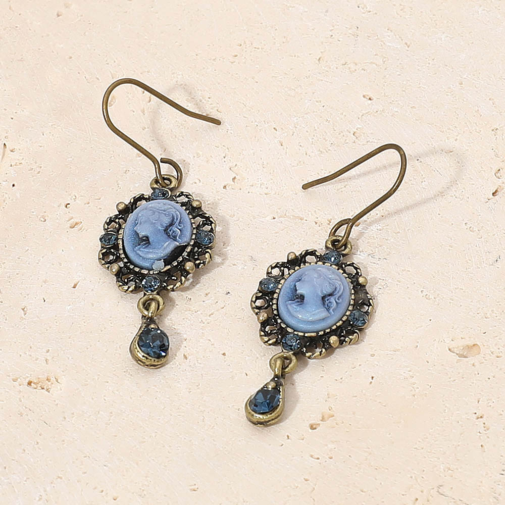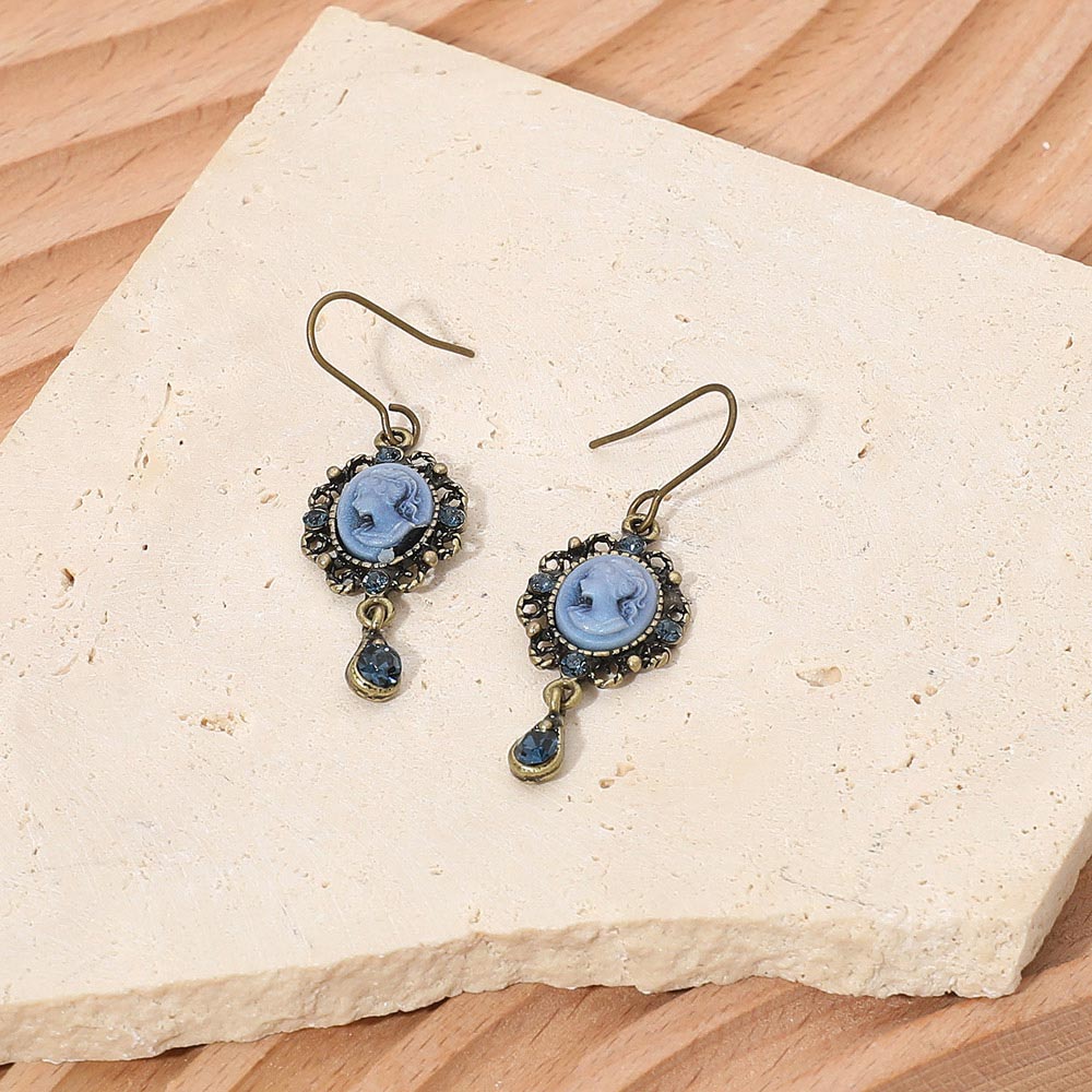 • Elegant vintage cameo drop earrings featuring detailed profile portraits framed with sparkling rhinestones and teardrop crystal charms. Perfect for adding a touch of timeless sophistication to both casual and formal outfits.
