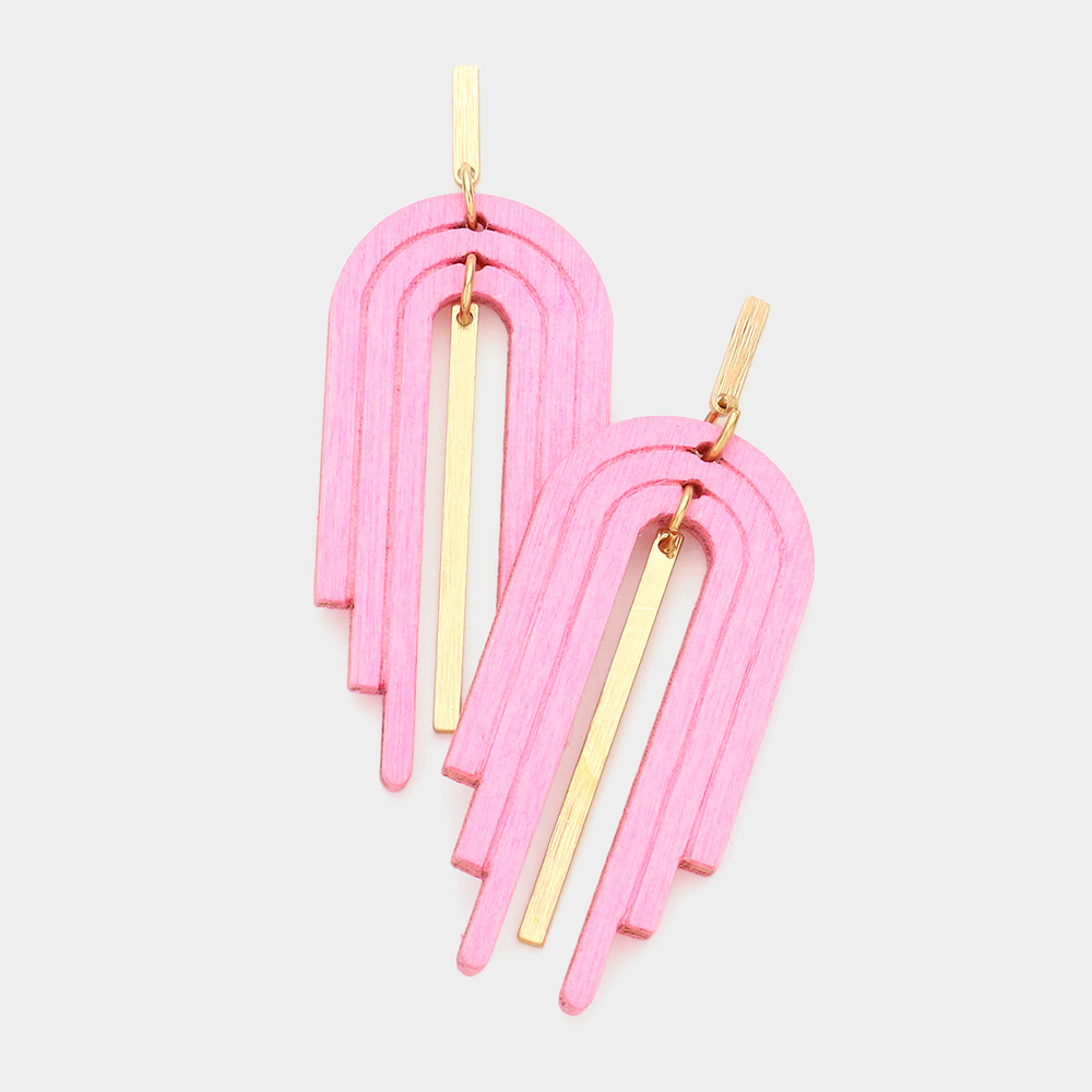 Details • Size : 0.8" X 2.25" • Post Back • Trendy geometric dangle earrings featuring layered arch shapes paired with sleek metallic accents. Lightweight and stylish, these earrings bring a modern pop to casual wear or add a fun twist to evening looks. • Lead and Nickel Compliant