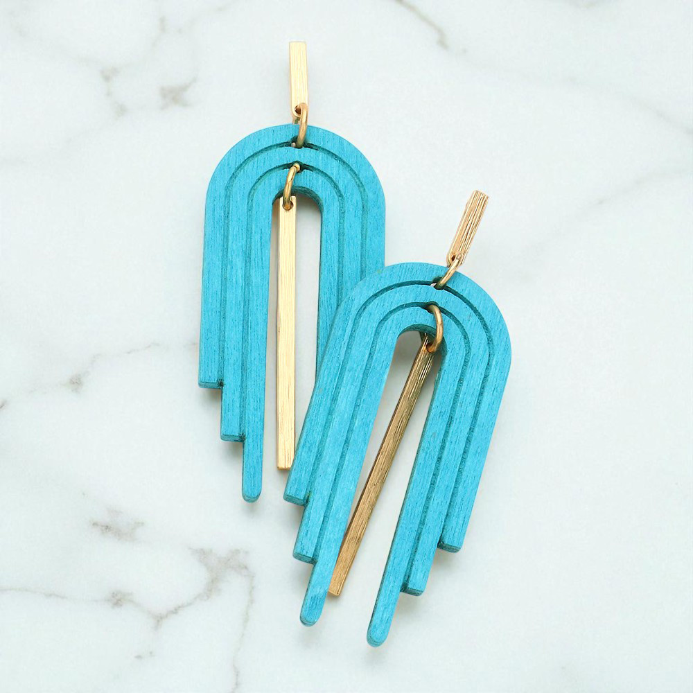 Details • Size : 0.8" X 2.25" • Post Back • Trendy geometric dangle earrings featuring layered arch shapes paired with sleek metallic accents. Lightweight and stylish, these earrings bring a modern pop to casual wear or add a fun twist to evening looks. • Lead and Nickel Compliant