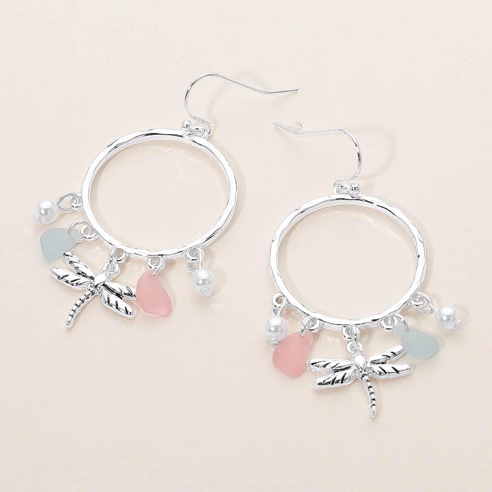 Dragonfly Sea Glass Charm Drop Open Ring Dangle Earrings
